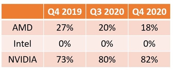 当然,如果单独看独显市场,Intel Xe还不成气候,NVIDIA拿下82%的市场,AMD拿下18%的市场。