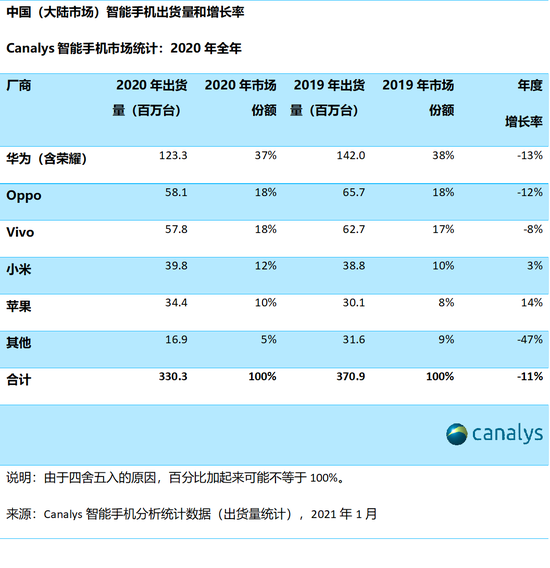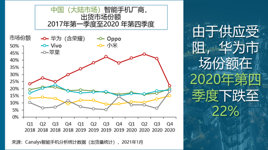中国大陆智能手机市场2020年第四季度出货量达到8400万部,同比下降4%。2020年全年出货同比下跌11%至3.3亿台,由于美国制裁导致华为业绩迅速恶化,整体市场复苏步伐遇阻。