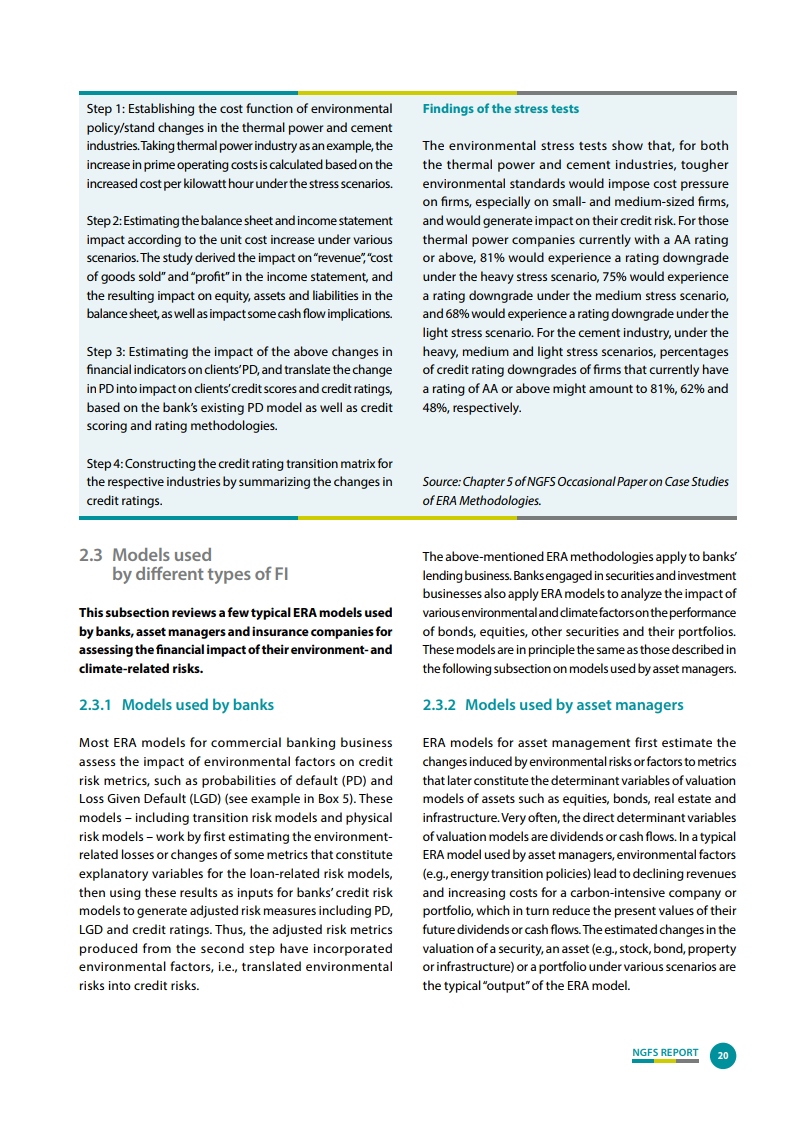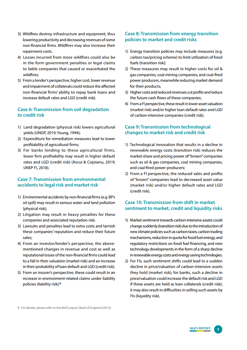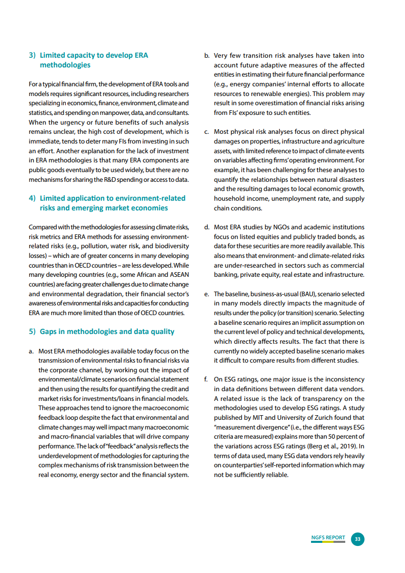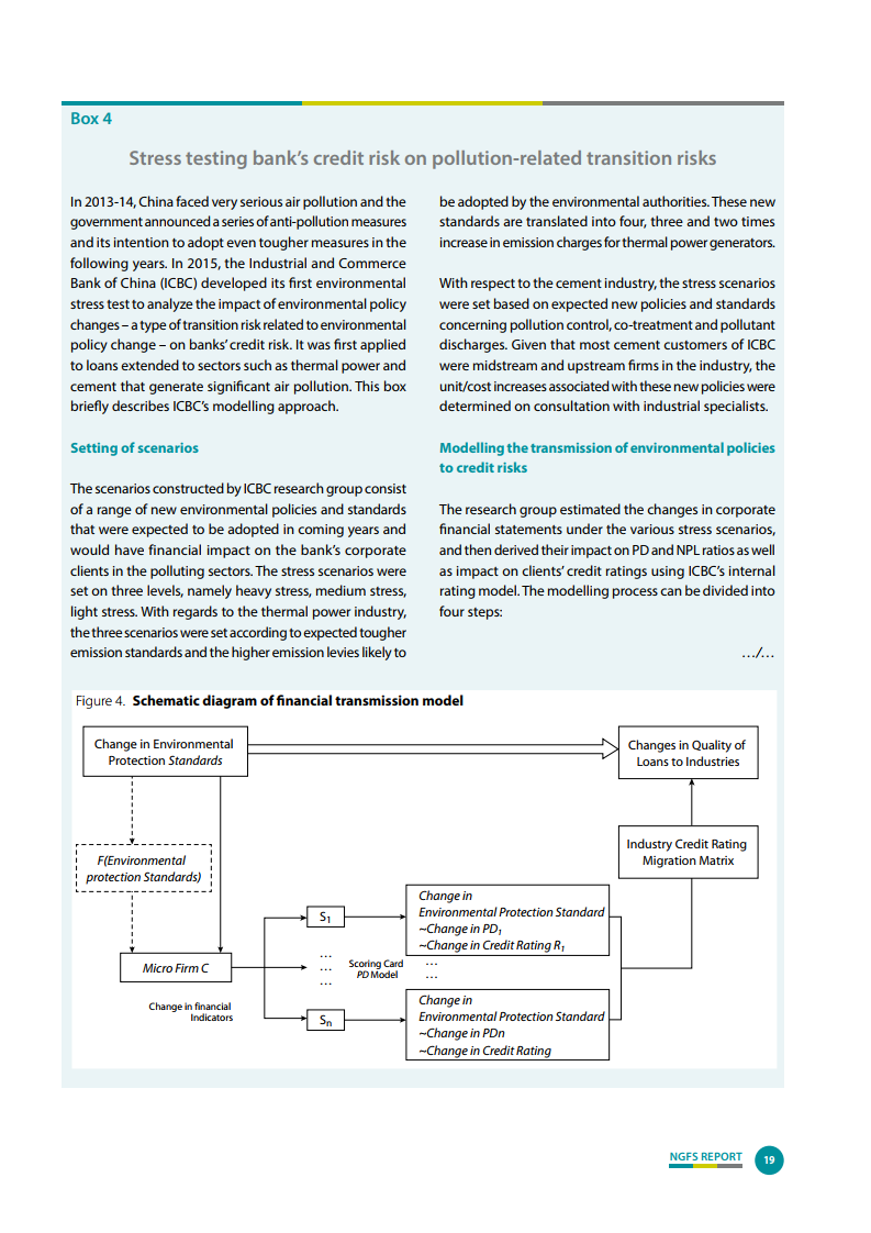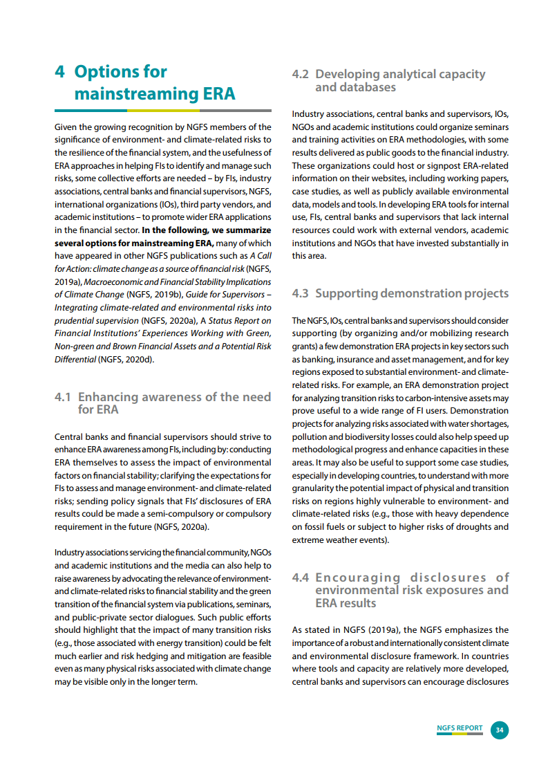 支持示范项目:NGFS、国际组织、央行和其他监管机构可以考虑对重点行业或重点地区的示范研究项目进行扶持,这些项目可针对银行业、资管业和保险业金融机构,并覆盖对环境和气候因素有重大风险敞口的地区和产业。