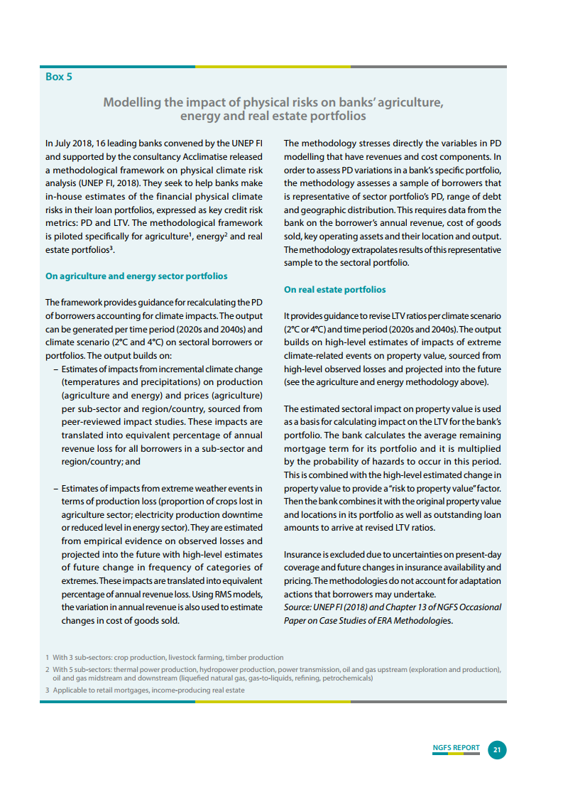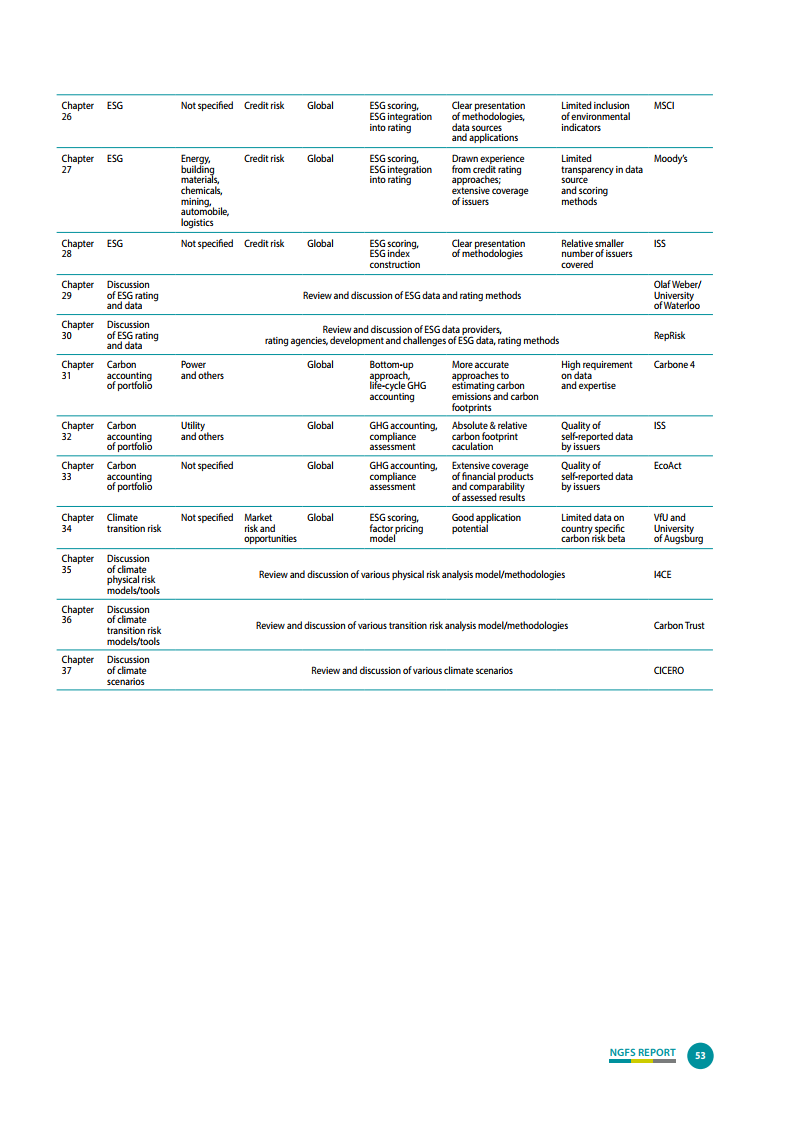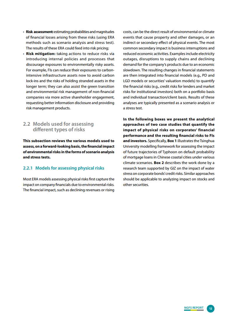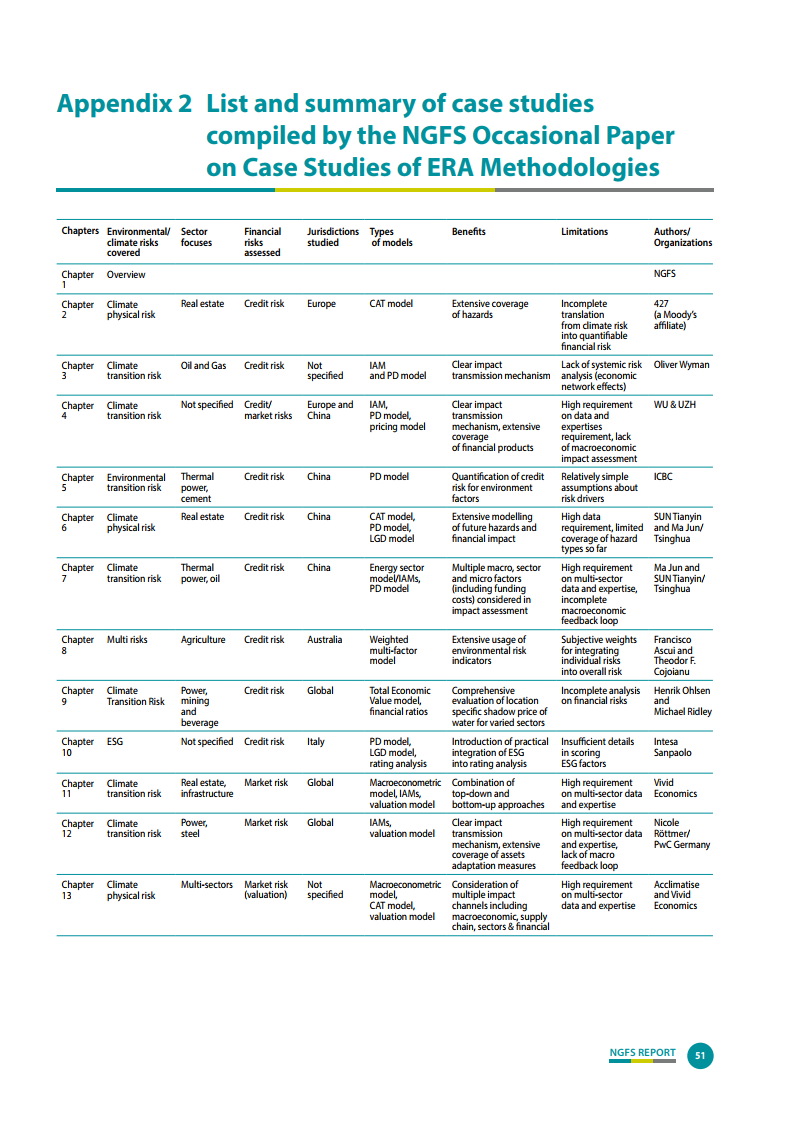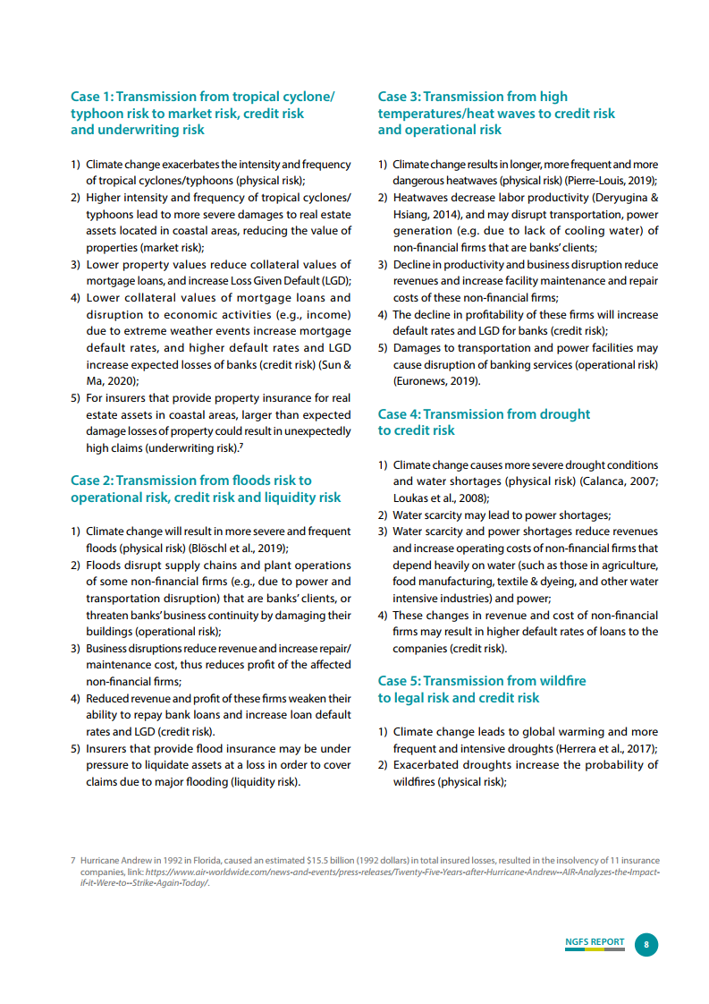 支持示范项目:NGFS、国际组织、央行和其他监管机构可以考虑对重点行业或重点地区的示范研究项目进行扶持,这些项目可针对银行业、资管业和保险业金融机构,并覆盖对环境和气候因素有重大风险敞口的地区和产业。