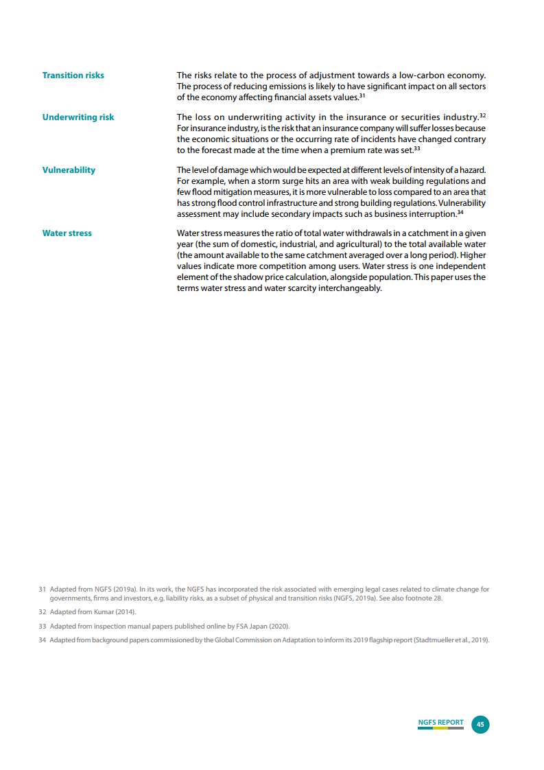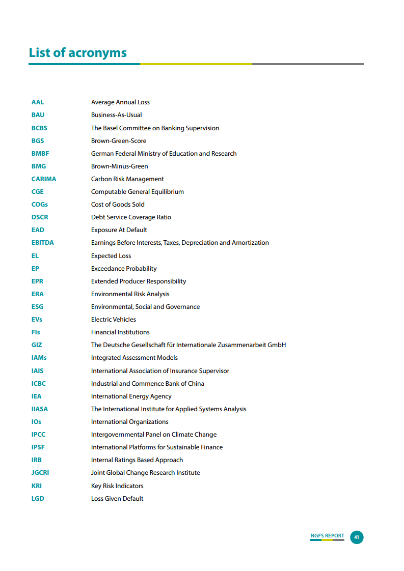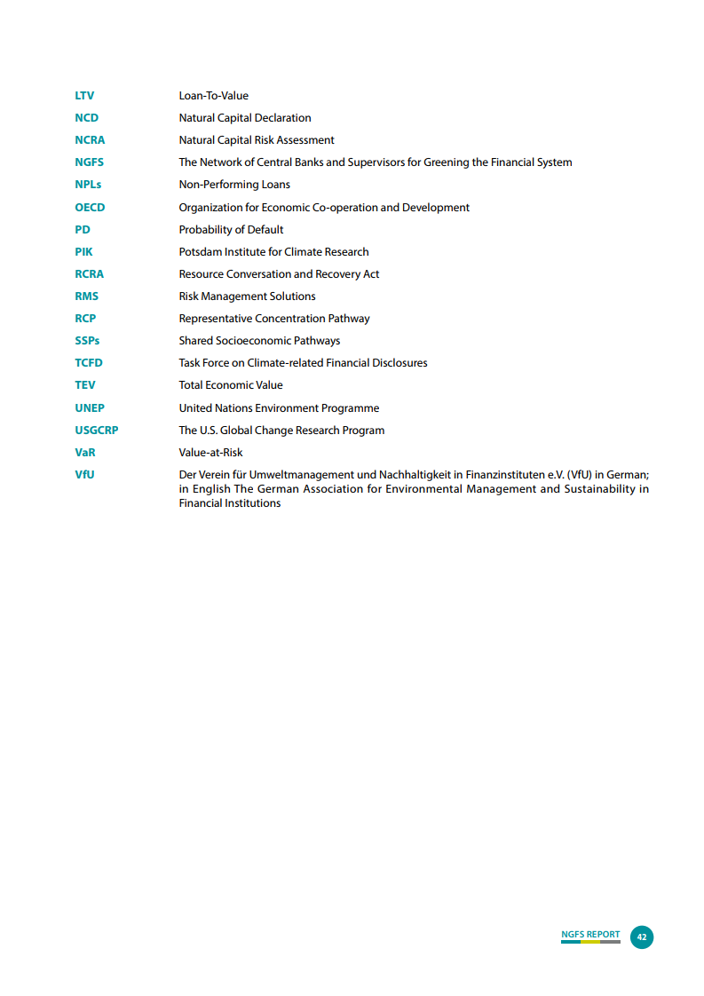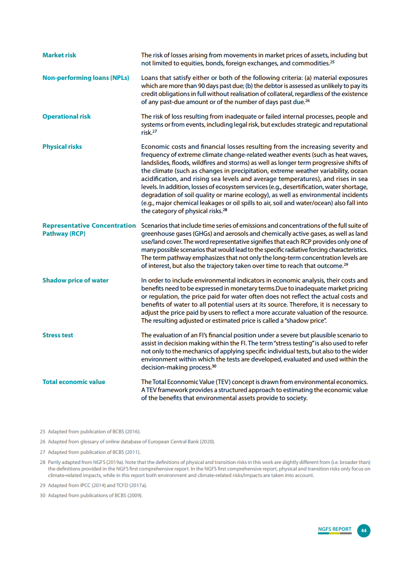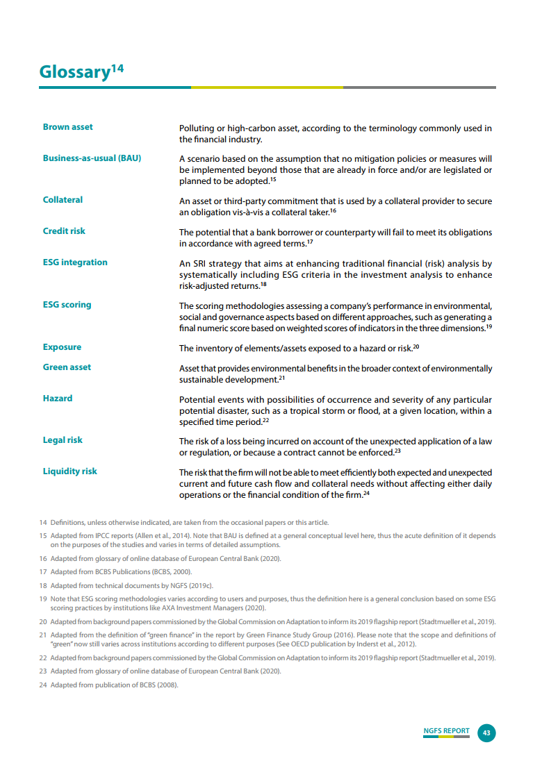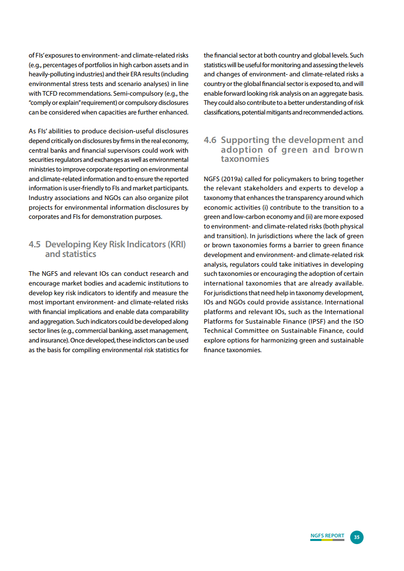建立关键风险指标(Key Risk Indicators,简称KRI)和相关统计数据库:在鼓励市场主体和学术机构研究与环境和气候相关的关键风险指标的同时,NGFS及相关国际组织自身也可开展相关研究。明确关键风险指标将有助于金融机构和监管部门识别、评估与管理环境和气候相关风险,并提升数据的可比性。