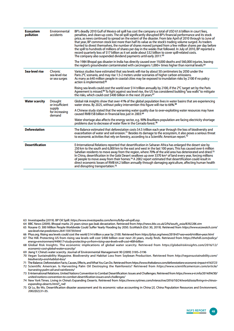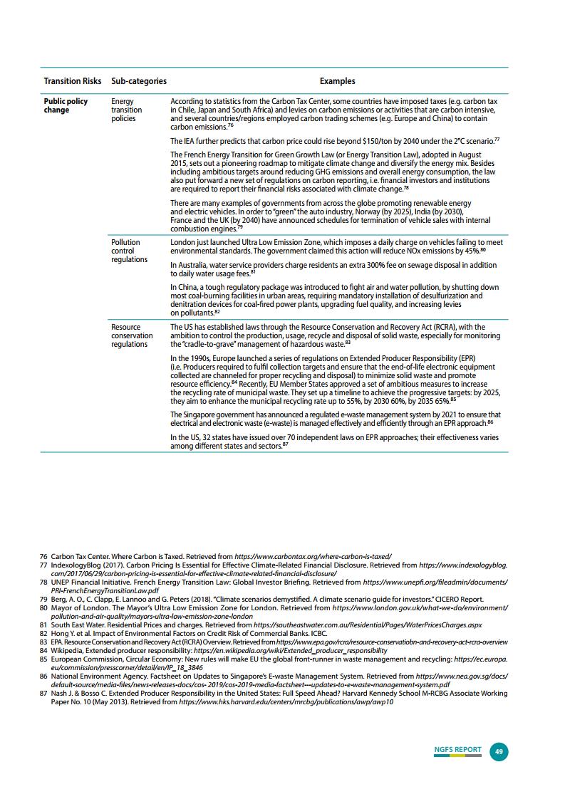 披露风险敞口和环境风险分析结果:应该建立一个国际通用的、健全的环境披露框架。在条件成熟的国家,央行和其他监管机构可以鼓励各金融机构根据气候相关财务披露(Task Force on Climate-related Financial Disclosures,简称TFCD)建议,披露其对环境和气候因素的风险敞口及环境风险分析结果。