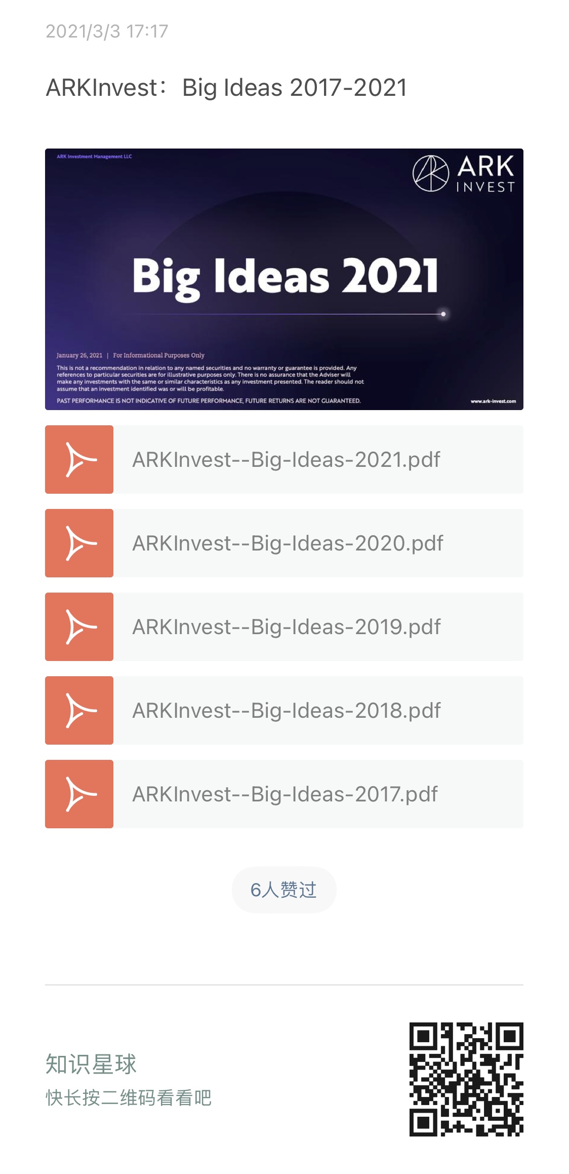 2017-2021年ARK Invest投资报告合集 更多阅读:消费者品牌报告:寻找真相中国人民银行:2019年第一季度城镇储户问卷调查报告Crunchbase:过去十年美国大型基金融资分析Demand Gen :制造商将数字转换扩展到销售和营销报告K-12报告:2017-2018全球数字学习现状ARK最新报告:2021年科技颠覆一切(130页)Invest Europe:2023年欧洲投资报告Knight Frank:2024年财富报告英国投资协会:2021-2022年英国投资管理调查报告NATIXIS:2022年全球退休指数报告Salesforce:2021年联网消费者报告IDC:2023年Q3全球个人电脑出货量同比下降7.2%Marketing Charts:观众表示,在线产品视频能够提高购买的可能性Hotels.com:2015中国游客境外旅游调查报告特斯拉:2022年Q1特斯拉累计交付汽车31万辆 同比增幅为81%