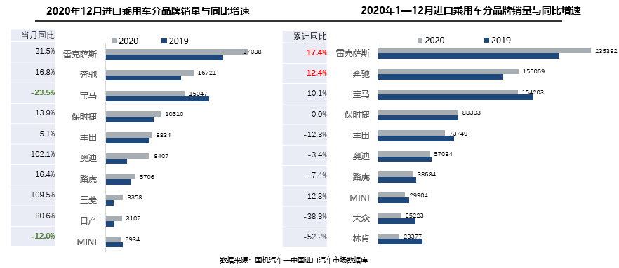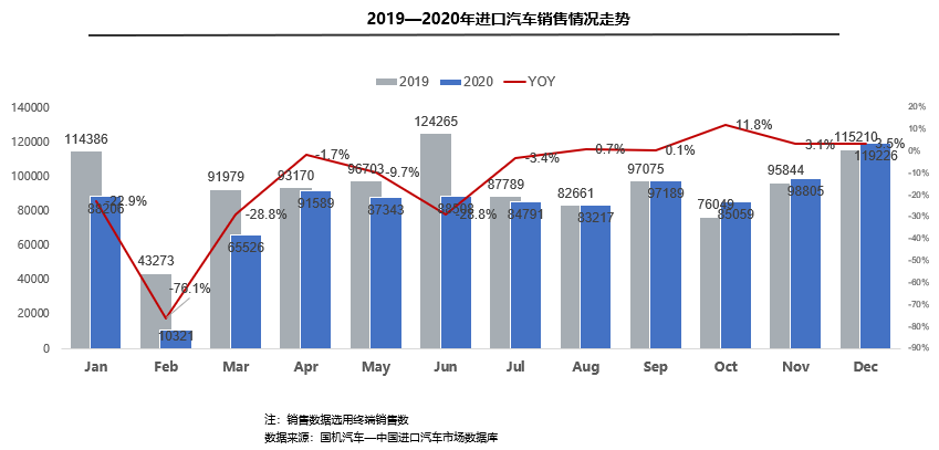 销售情况:1—12月,进口乘用车终端销售100万辆,累计同比下滑10.6%,下滑幅度继续收窄。12月,进口乘用车终端销售11.9万辆,同比增长3.5%,主要得益于SUV的销售拉动。