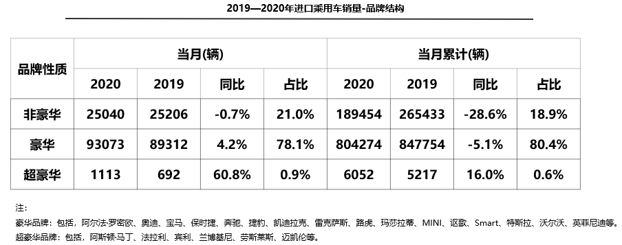 品牌结构:1—12月,进口品牌第一名仍是雷克萨斯,奔驰位居第二;前十品牌中除雷克萨斯、奔驰实现增长之外,其余品牌仍下降。豪华品牌仍是销售主力,占销售总量的80.4%;非豪华品牌下滑28.6%,豪华下滑5.1%,下滑幅度收窄,超豪华品牌逆势增长16.0%。