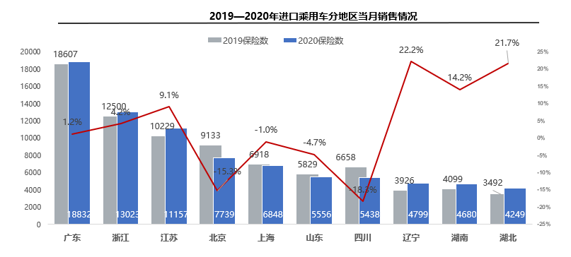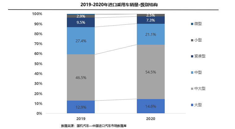 级别结构:1—12月,大型和中大型进口车细分市场份额相比2019年继续提升,分别提高1.7和8.0个百分点;其他细分市场份额均有所减少,其中,中型和紧凑型进口车份额分别减少6.3和2.1个百分点。数据显示疫情对中高端市场影响相对较小。