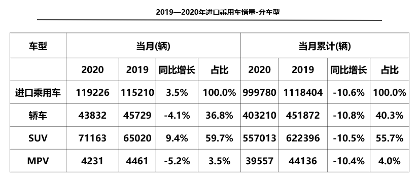 车型结构:1—12月,进口乘用车销售车型仍以轿车和SUV为主,占比96%;轿车、SUV和MPV降幅分别为10.8% ,10.5%和10.4%。