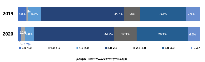 l2020年1—12月,2.0~2.5L是第一排量区间,份额为44.2%,该区间份额下降1.5个百分点,主要由于2.0L排量车型降幅较大;
