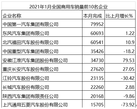 2021年1月全国商用车销量前10名企业中,江淮汽车销量(批发)环比增长幅度最大,高达79.53%,以34730辆拔得头筹。上汽通用五菱则以环比下降-73.92%,共销售15705辆在前10名企业中位列最后一名。