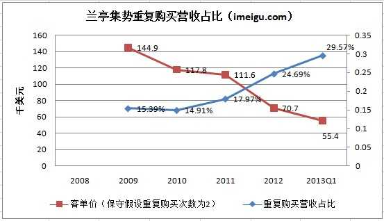 但另一方面,配件、家居品的单价相对要低,导致兰亭集势近期客单价大幅下降。我们保守的假设重复购买的用户一年只消费两次,可以大致推断出兰亭集势的客单价,2010、2011、2012年、2013Q1分别约为117.8美元、111.6美元、70.7美元、55.4美元,客单价明显下降。