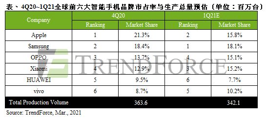 市场调查机构 Trendforce 公布的最新统计数据,苹果在 2020 年第 4 季度手机出货量为 7760 万部,领先三星成为最畅销的智能手机厂商。OPPO 和小米紧随其后,第五名和第六名分别为华为和 vivo。