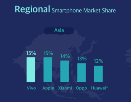 报告显示,在亚洲市场,vivo的市场占有率达到15%,与苹果公司并列第一。小米公司、OPPO以及华为排在三至五位,市场占有率分别为14%、13%、12%。华为的数据包含了荣耀智能机出货量。