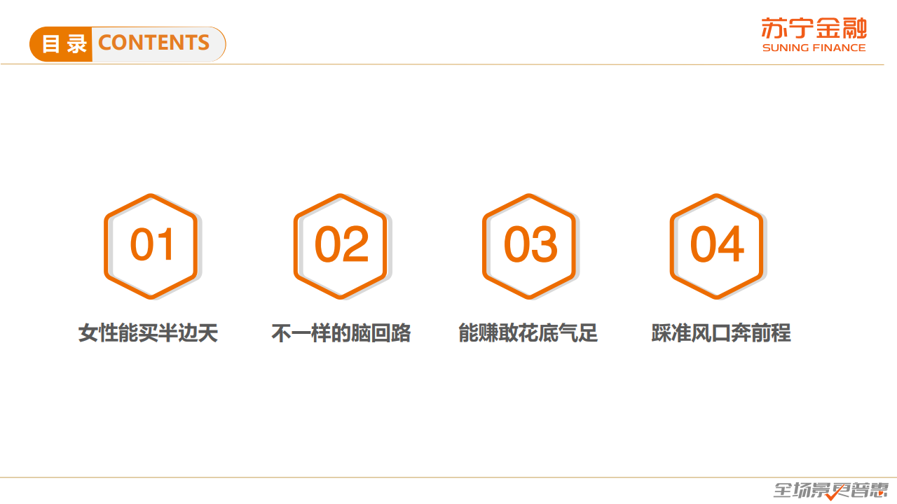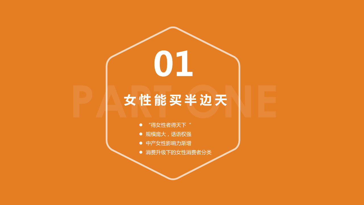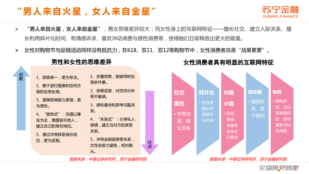 (1)女性能买半边天:通过梳理女性群体的人口规模与消费特征来初步了解这个群体;(2)不一样的脑回路:探究女性群体在消费时,脑子里到底在想些什么;(3)能赚敢花底气足:解码女性消费崛起背后的三大驱动力;
