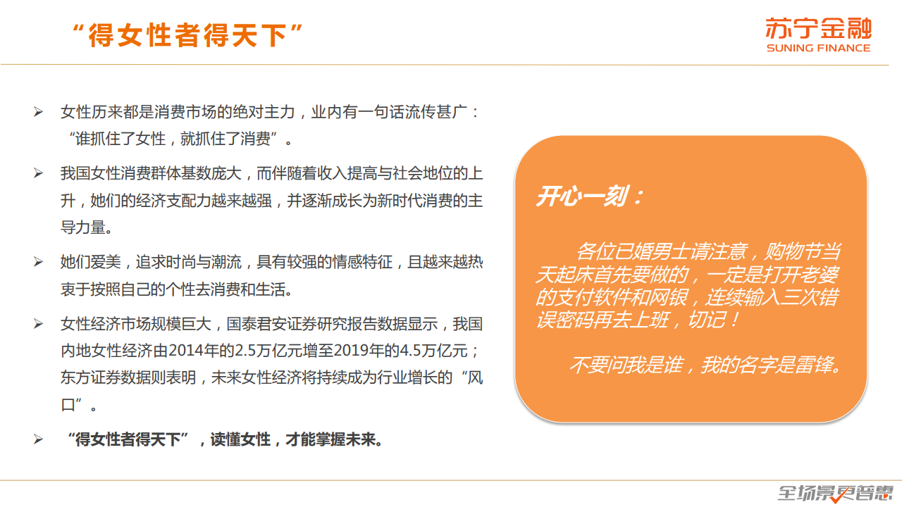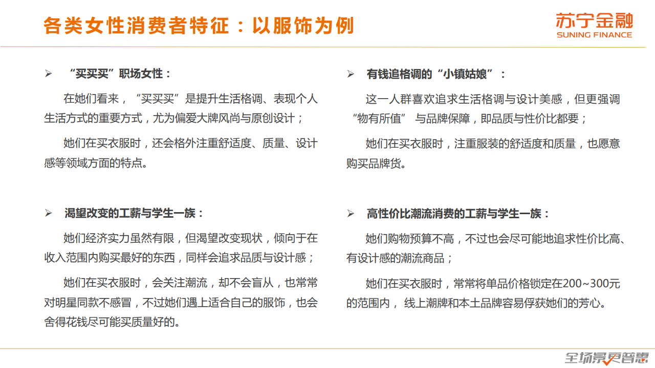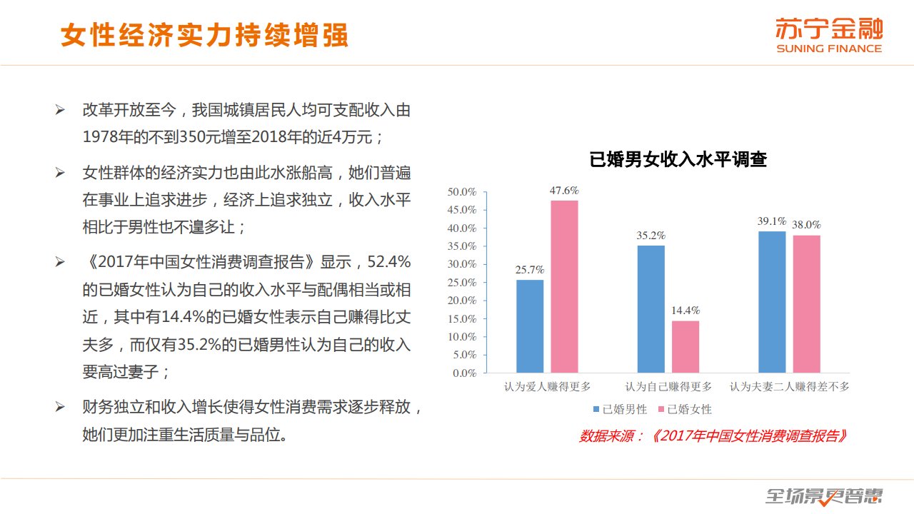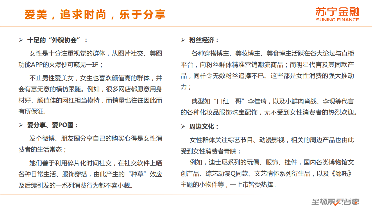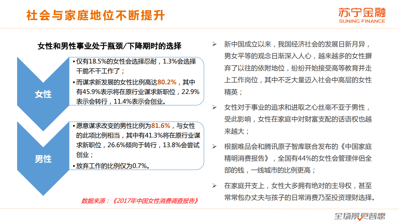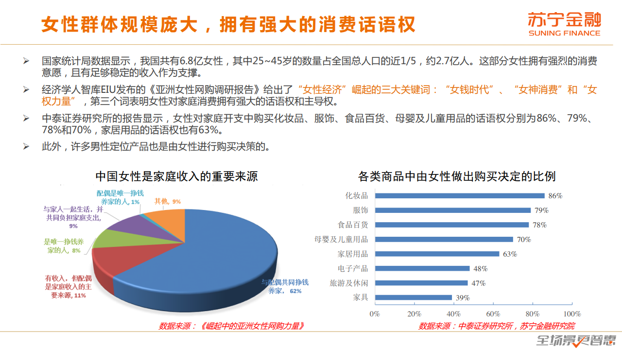 于是,我们需要读懂女性群体,洞悉她们的消费偏好与习惯,进而更加有的放矢地布局未来。今日,苏宁金融研究院发布《女性群体消费趋势研究报告》(下简称《报告》),旨在深度剖析女性的消费画像,并对各个领域潜在的商机进行预判。