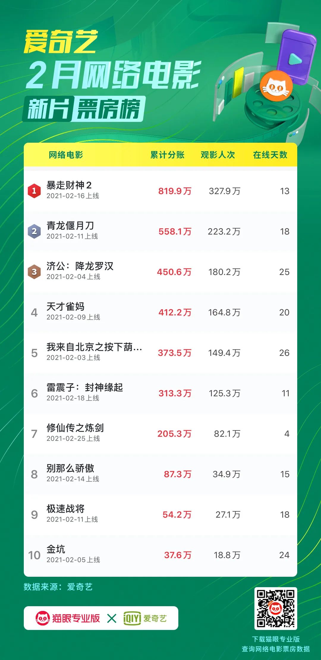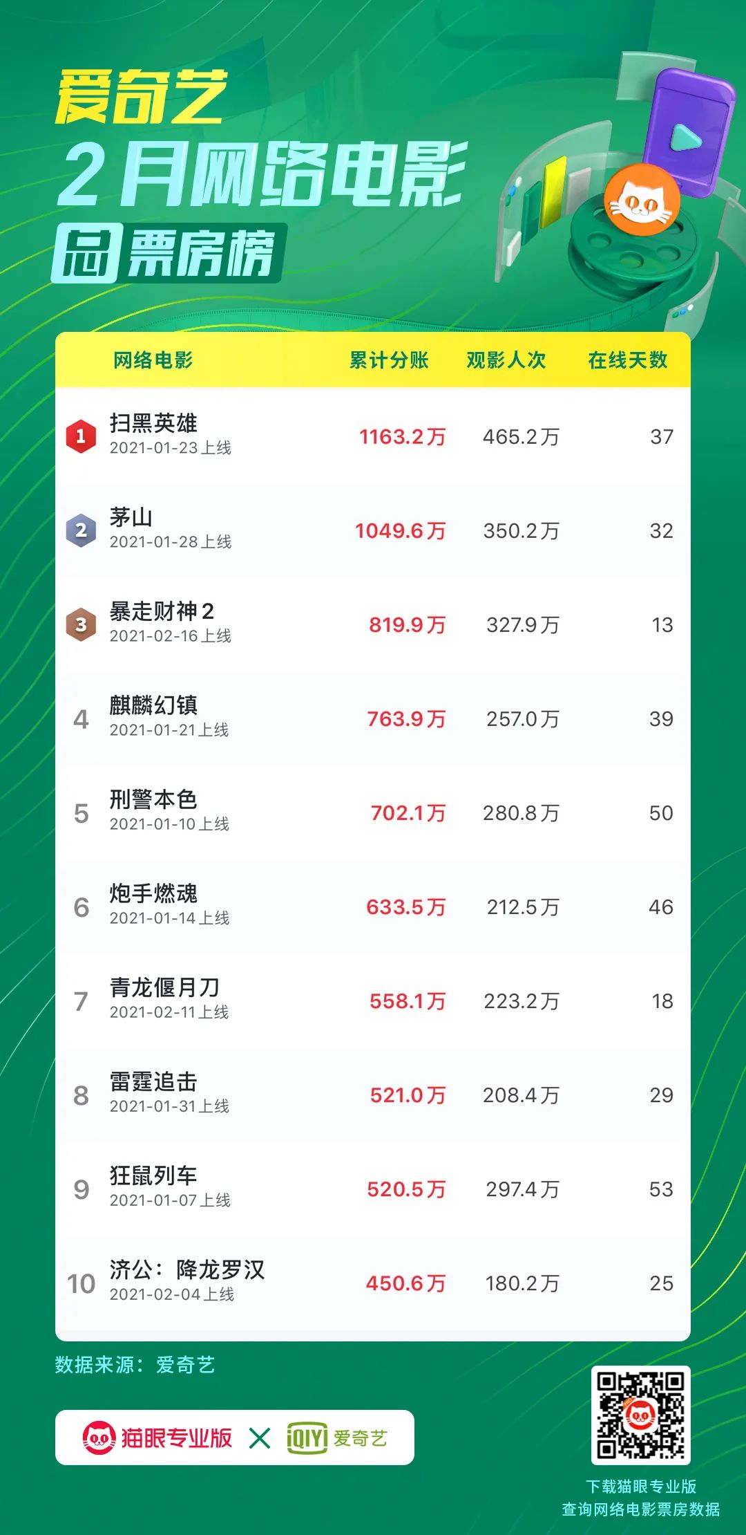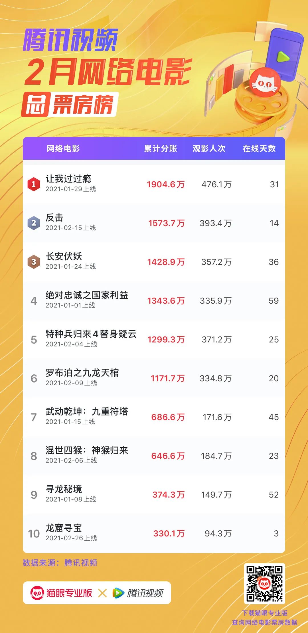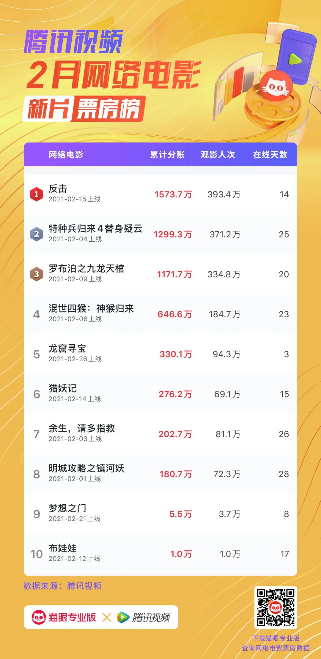 猫眼研究院:2021年2月网络电影票房榜 【爱奇艺2月网络电影票房榜】 总票房榜:《扫黑英雄》《茅山》《暴走财神2》 位列前三名 新片票房榜:《暴走财神2》《青龙偃月刀》《济公:降龙罗汉》 位列前三名 【腾讯视频2月网络电影票房榜】 总票房榜:《让我过过瘾》《反击》《长安伏妖》 位列前三名 新片票房榜:《反击》《特种兵归来4替身疑云》《罗布泊之九龙天棺》 位列前三名 【优酷2月网络电影票房榜】 总票房榜:《狄仁杰之飞头罗刹》《夺命狙击2》《南少林之怒目金刚》 位列前三位 更多阅读:猫眼研究院:2022年贺岁档票房破6亿猫眼研究院:2023年度票房破250亿猫眼研究院:春节档新片总票房(含点映)破亿!猫眼研究院:2022国庆档总票房14.9亿猫眼研究院:2023年度票房破百亿猫眼研究院:2023年度大盘票房破200亿猫眼研究院:2023年5月总票房破30亿猫眼研究院:2022年国庆档总票房破8亿猫眼研究院:2019年10月票房大破80亿猫眼研究院:2022贺岁档票房破2亿猫眼研究院:2022国庆档数据洞察猫眼研究院:2022年中秋节票房破1.4亿猫眼研究院:2022年短剧热度榜猫眼研究院:2022年度大盘票房破百亿猫眼研究院:2021年度电影票房榜–TOP10国产电影占据8部