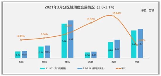从各区域的交易情况来看,3月第二周西南地区的增速最为明显,环比上一周增长了15.80%,日均交易量为0.97万辆。其中,成都地区交易需求增长超30%以上。其次为西北地区因基数据较小,环比增长13.31%,日均交易量为0.34万辆;排名第三位的是交易量占比最多的华东地区,日均交易量为1.98万辆,增幅也超过9%,其中厦门地区的日均交易量也出现了超20%的增长。另据上海市二手车行业协会提供的数据显示,上海市二手车第二周环比增长5%,其中转籍车辆供献了3%以上,新车置换出的旧车比例也在上升。华北地区环比增长7.64%,日均交易量为0.66万辆;东北地区环比增长6.93%,日均交易量0.38万辆;本周中南地区增长幅度最小,仅为4.99%,日均交易量1.53万辆。