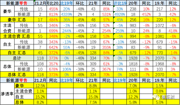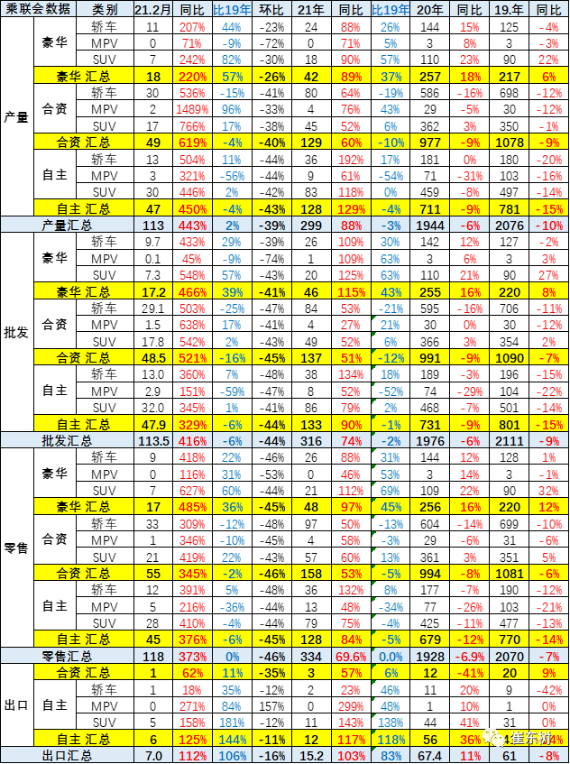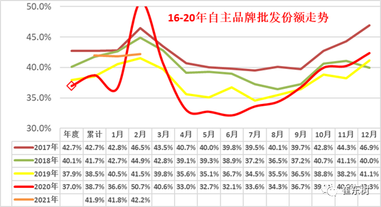 2021年2月份自主品牌份额42.2%,较前几年的份额仍改善较大,份额稍好于19年水平。自18年2021年2月以来,连续20个月的自主品牌份额都同比下降较大。19年的全年份额下降速度仍然较大。20年的疫情下的自主品牌份额2-3月回升。随后4-7月下降较大。9-2021年2月靠新能源回暖。