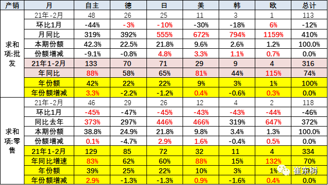 2月主流合资品牌零售同比增长13%,但环比12月下降10%;其中美系品牌市场零售份额达到9.4%,同比增长0.8个百分点,表现超强。日系品牌21.6%,同比下降2个百分点,低于德系品牌 4.2个百分点。