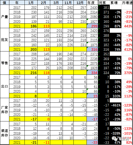 2021年1-2月的渠道库存相对减少33万辆,较前两年的1-2月去库存20万辆水平稍高。随着芯片短缺的矛盾凸显,部分车企灵活调整的精益生产方式也受到上游配套企业的质疑,库存既是万恶之源也是是生存之源。