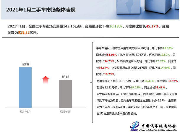 二手车板块,首先确实是比预期要高,从单月交易量比预期要高一些。整体看1月份二手车交易市场还算是交了一个比较满意的答卷,单月交易量140万辆以上,达到143.16万辆,跟12月份环比相比是下降,下降16.18%,月度同比是增长45.37%。