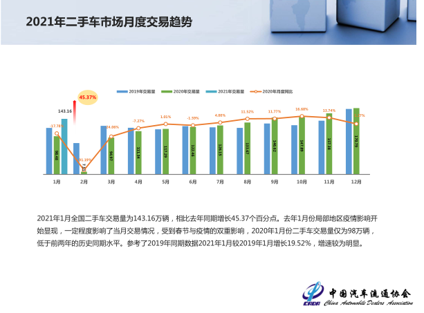 2021年1月全国二手车交易量为143.16万辆,相比去年同期增长45.37个百分点。去年1月份局部地区疫情影响开始显现,一定程度影响了当月交易情况,受到春节与疫情的双重影响,2020年1月份二手车交易量仅为98万辆,低于前两年的历史同期水平。参考了2019年同期数据2021年1月较2019年1月增长19.52%,增速较为明显。