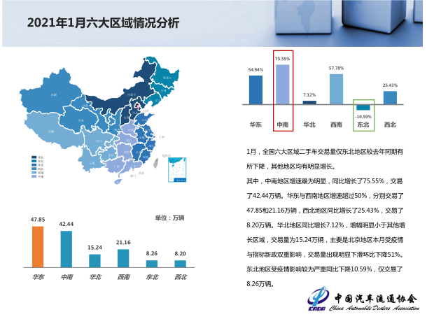 1月,全国六大区域二手车交易量仅东北地区较去年同期有所下降,其他地区均有明显增长。