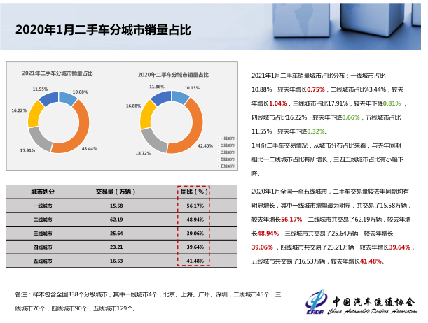 2021年1月二手车销量城市占比分布:一线城市占比10.88%,较去年增长0.75%,二线城市占比43.44%,较去年增长1.04%,三线城市占比17.91%,较去年下降0.81% ,四线城市占比16.22%,较去年下降0.66%,五线城市占比11.55%,较去年下降0.32%。