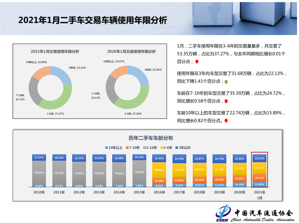 1月,二手车使用年限在3-6年的交易量最多,共交易了53.35万辆,占比为37.27%,与去年同期相比增长0.01个百分点;