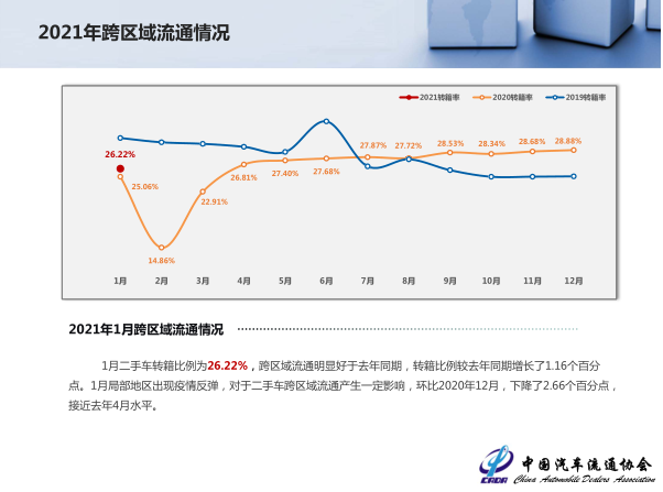 1月二手车转籍比例为26.22%,跨区域流通明显好于去年同期,转籍比例较去年同期增长了1.16个百分点。1月局部地区出现疫情反弹,对于二手车跨区域流通产生一定影响,环比2020年12月,下降了2.66个百分点,接近去年4月水平。