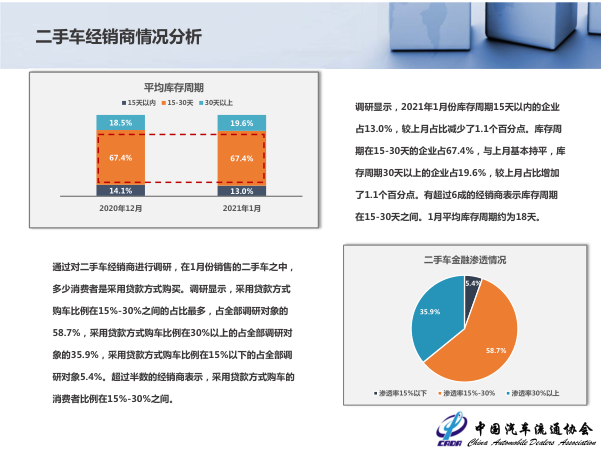 2021年1月份库存周期15天以内的企业占13.0%,较上月占比减少了1.1个百分点。库存周期在15-30天的企业占67.4%,库存周期30天以上的企业占19.6%,较上月占比增加了1.1个百分点。有超过6成的经销商表示库存周期在15-30天之间。1月平均库存周期约为18天。