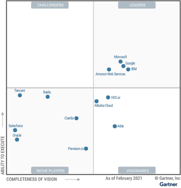 市场调查机构 Gartner 近日公布了 2021 年云 AI 开发者服务的 Magic Quadrant(魔力象限)。在报告中,微软位于“‘Leaders”(领导者)象限内,并且在执行能力轴上定位最高。在愿景的轴上,微软的位置仅次于谷歌和 IBM。目前微软为机器学习、计算机视觉和自然语言提供了全面的产品。Gartner 强调,以下是微软 AI 开发者服务的优势和注意事项。