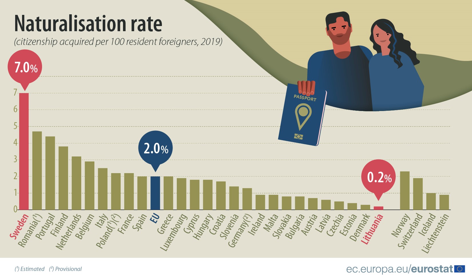2019年,入籍率最高的国家是瑞典(每100名外籍居民中有7个获得公民身份)、罗马尼亚(4.7)和葡萄牙(4.4),其次是芬兰(3.8)、荷兰(3.2)和比利时(2.9)。