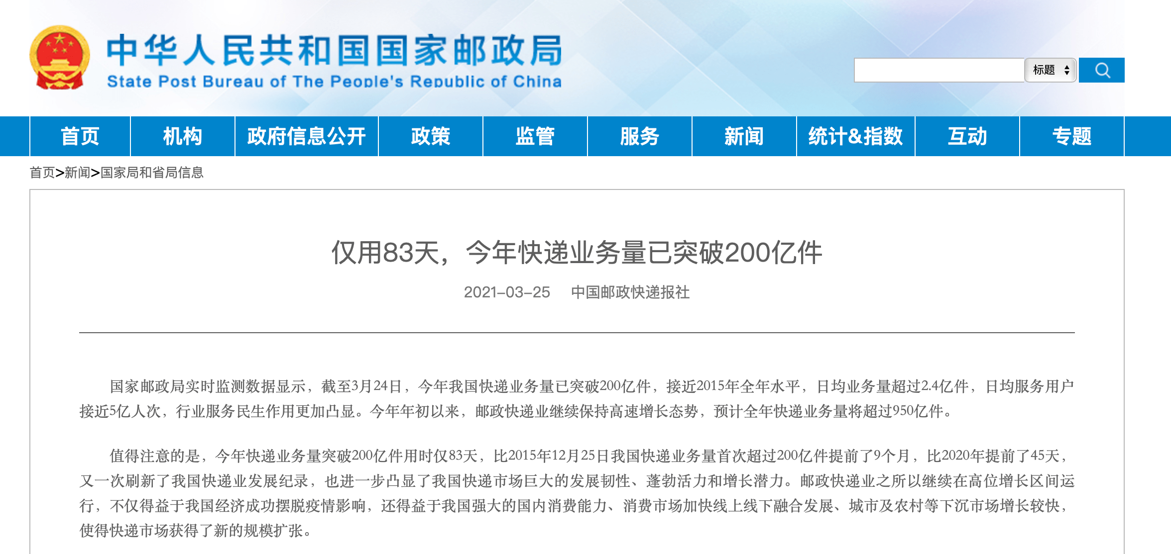 国家邮政局实时监测数据显示,截至3月24日,今年我国快递业务量已突破200亿件,接近2015年全年水平,日均业务量超过2.4亿件,日均服务用户接近5亿人次,行业服务民生作用更加凸显。今年年初以来,邮政快递业继续保持高速增长态势,预计全年快递业务量将超过950亿件。