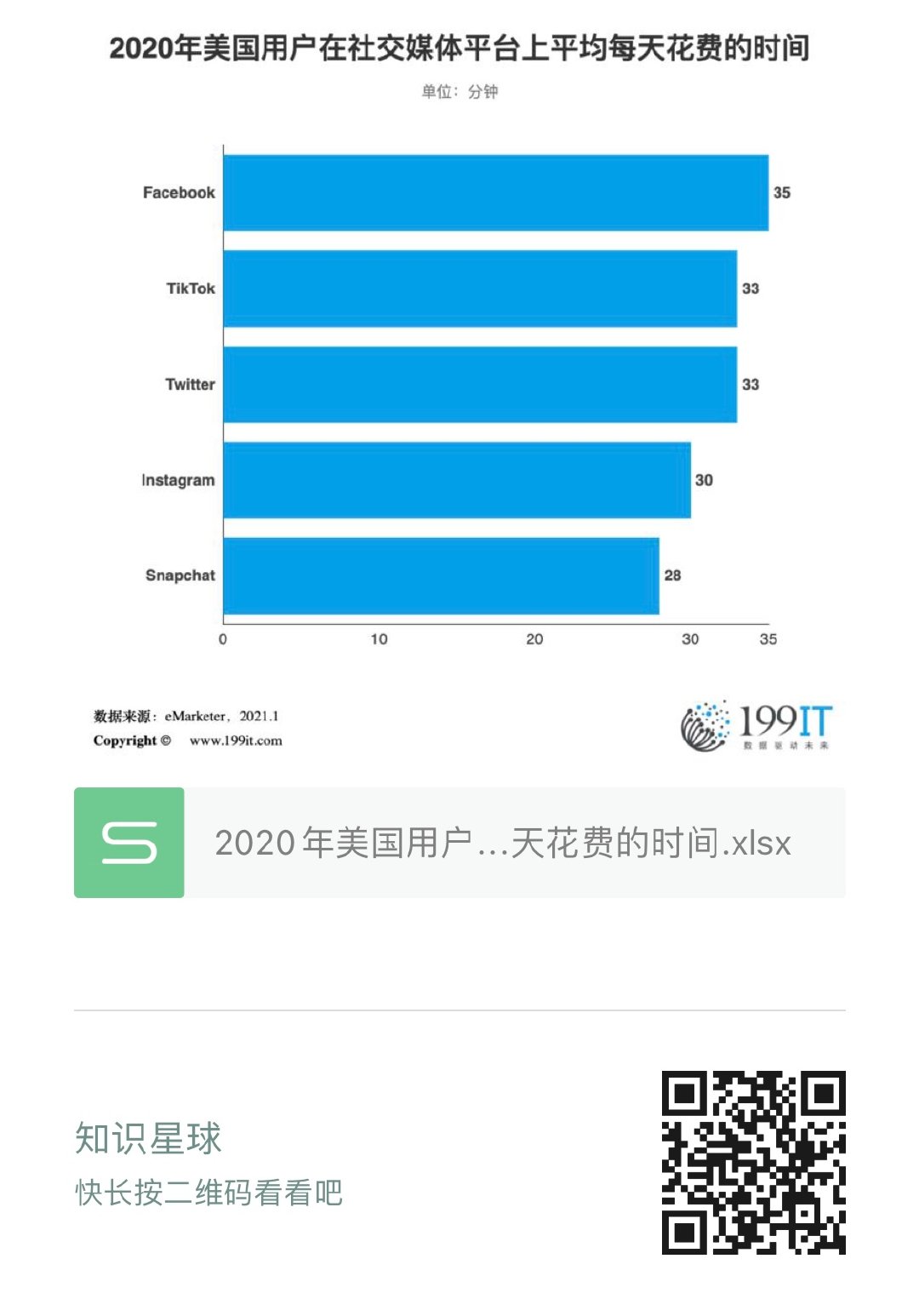 2020年美国用户在社交媒体平台上平均每天花费的时间(附原数据表) 更多阅读:2024年8月美国网红认为社交媒体平台替代TikTok比例预测(附原数据表) 美国使用最广泛的社交媒体平台(附原数据表) Umassd:8%的《财富》 500强公司有TikTok帐户华盛顿大学:研究发现多措并举可让Twitter错误信息减少53.4%Conviva:2021年Instagram视频报告Harris:2021年TikTok淘金报告Morning Consult:3/4的美国人不会为社交媒体平台付费Umassd:2018 Inc. 500社交媒体使用情况调查黑莓中国数字营销–信息图Meta:Instagram全球月活跃用户达到 20 亿eMarketer:2019年Facebook和谷歌占英国数字广告市场的68.5%短信效率高于其他社交媒体平台AnyMind:2021年亚洲意见领袖营销报告全球社交媒体平台每小时的留言大约有15亿条:企业如何利用社交情报创造价值2020年全球各地区5G普及率(附原数据表)