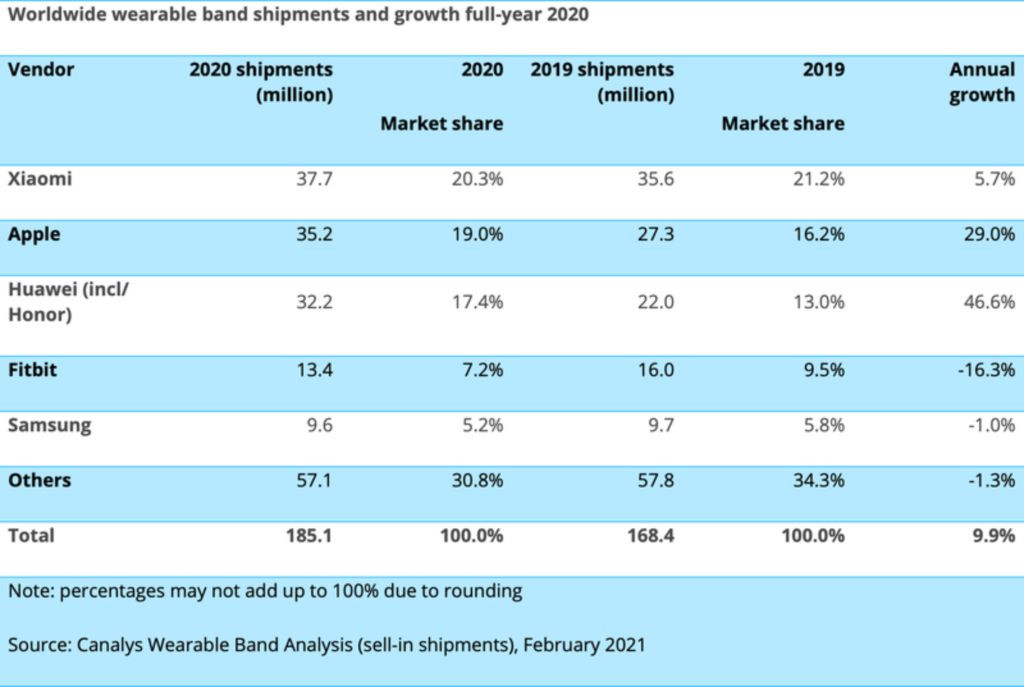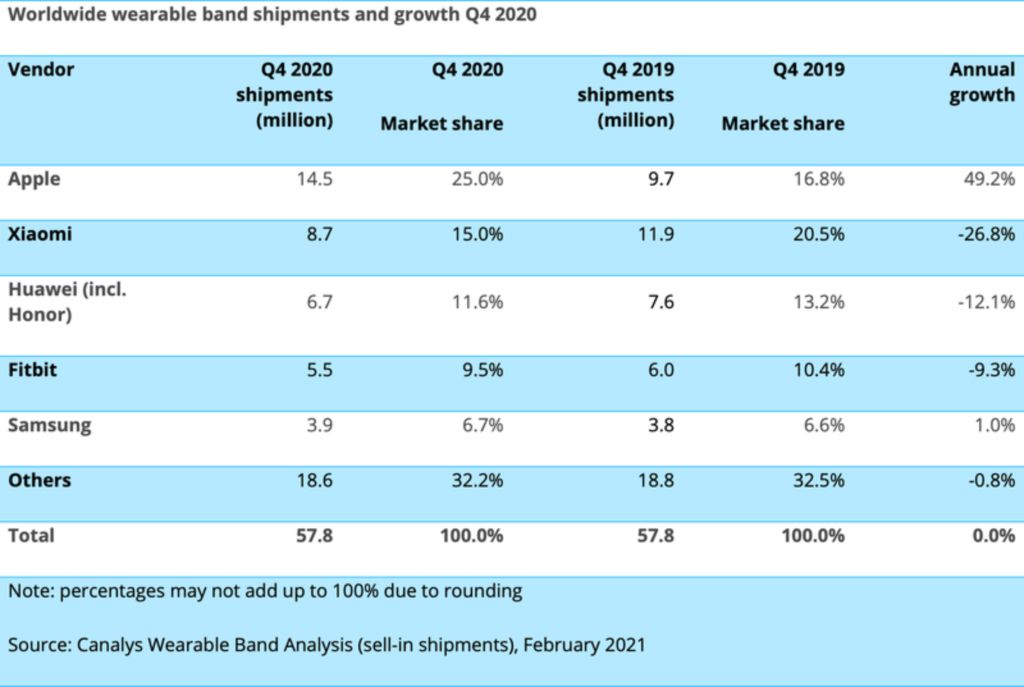 虽然苹果在 2020 年第 4 季度卖出了最多的可穿戴表带,但它并不是 2020 年的主导厂商。这个称号由小米获得,年出货量为 3770 万台。苹果在2020年的Apple Watch总出货量估计为3520万只,高于去年同期的2730万只。中国品牌小米销售一系列价格非常实惠的智能表带,价格比Apple Watch实惠得多,有些表带的价格低至30美元。
