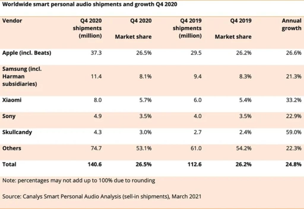 苹果在 2020 年第 4 季度出现了强劲的增长,估计出货量为 3730 万个无线耳塞和耳机,市场份额为 26.5%。2020 年第 4 季度的出货量比去年同期增长了 26.6%,苹果以较大的优势击败了所有其他竞争对手。