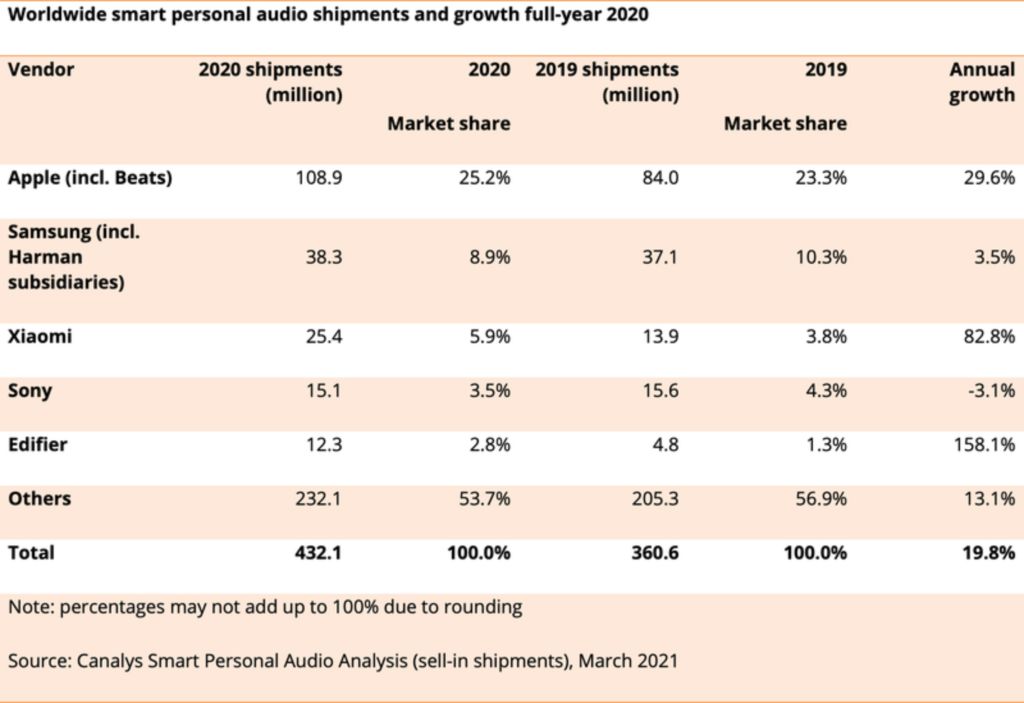 根据市场调查机构 Canalys 今天分享的最新数据,苹果“智能个人音频”(包括 AirPods 和 Beats 耳机)在 2020 年全年的出货量预估为 1.089 亿台,相比较 2019 年(8400 万台) 同比增长了将近 30%,占据了 25.2% 的市场份额。