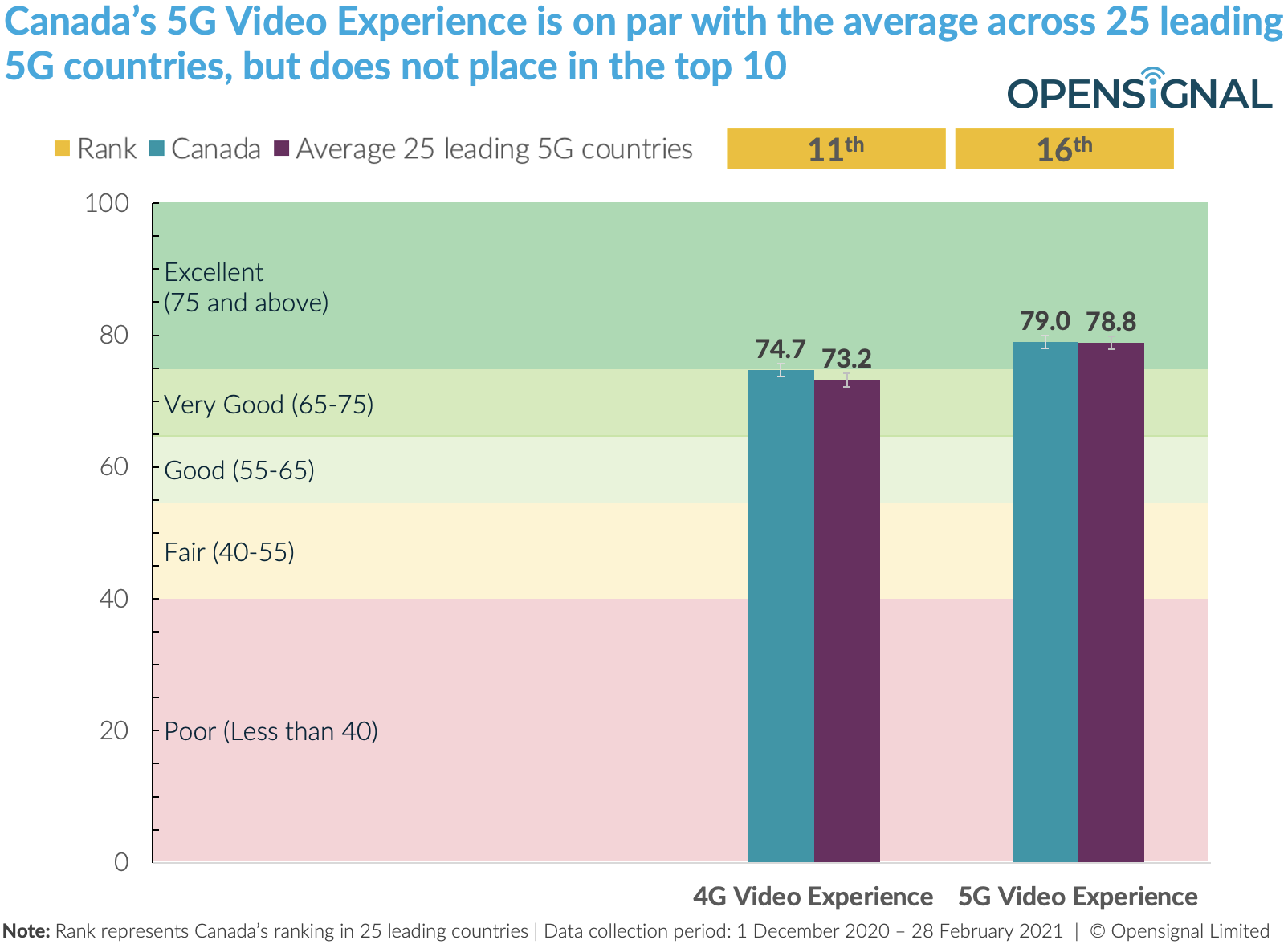 通过手机收看流媒体视频时,加拿大用户在连接到5G时享受到了优秀的视频体验(75分或以上)。相比之下,4G视频体验评价非常好(65-75分)。