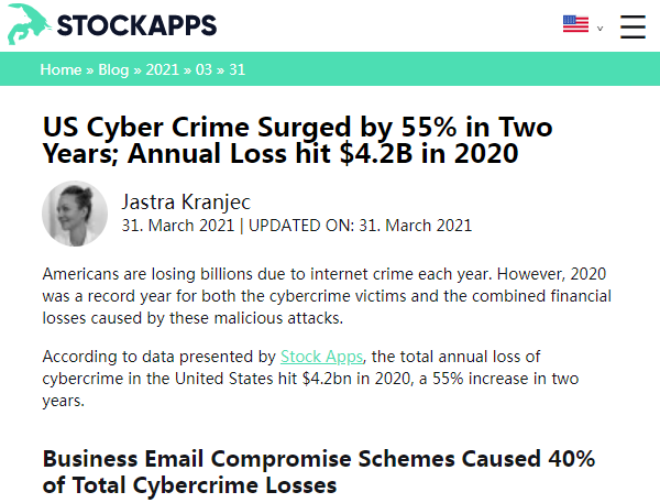 根据 StockApp.com 周二发布的数据,过去两年间,美国网络犯罪数量大涨 55% 。仅 2020 年,黑客入侵后的数据泄露、业务破坏和连带伤害,已经造成了高达 42 亿美元的损失,且其中有 18 亿美元(42%)与企业电子邮件泄露事件有关。