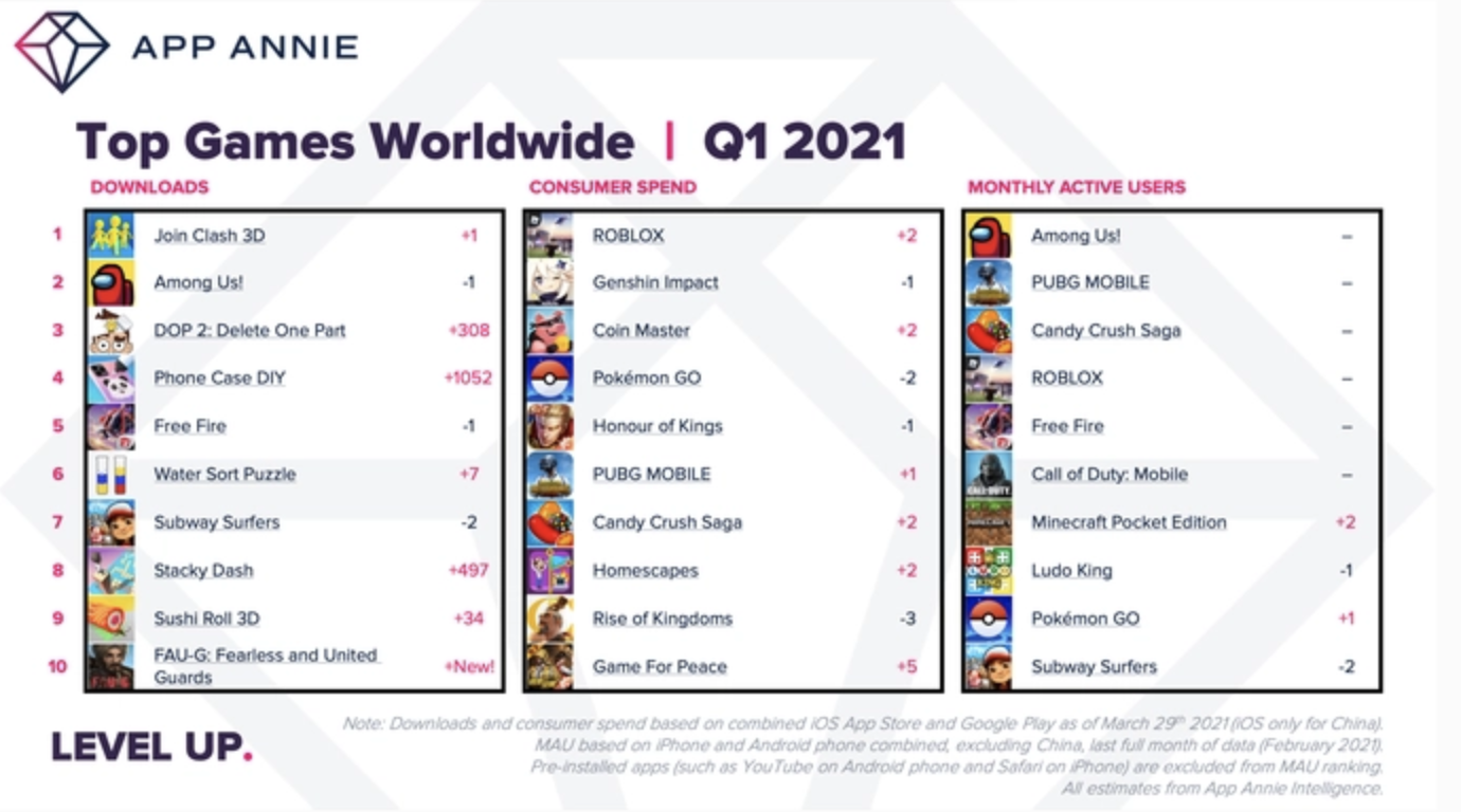 在消费者开支额度上,少儿游戏平台软件Roblox排名第一,排在之后的包括Genshin Impact、Coin Master、Pokemon Go。