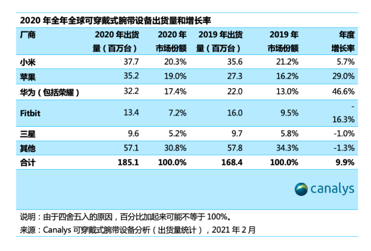 考虑到供应链因部件短缺而受到制约,Canalys调整了2021年的市场预测,预计可穿戴式腕带设备将增长10.2%至2.04亿台。