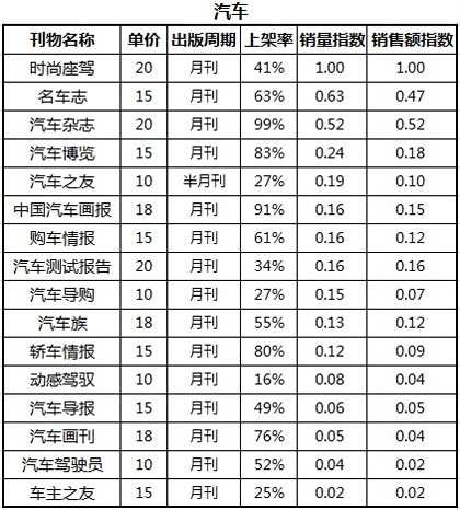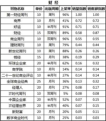 近日,梅花信息携手复星发行、东方书报亭共同推出2013年1月”报刊零售上海区域指数”。本指数榜单期刊分类方法最早由复星发行提供标准,今年又联合东方书报亭公司共同参与。其中,销售量为实际销售数量,销售额是实销数×封面定价。所有的数据在统计的时候,周刊、双周刊、半月刊、旬刊按照单期销量计算。