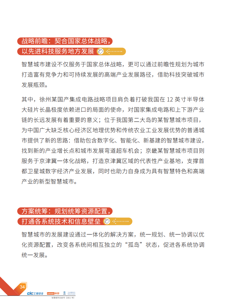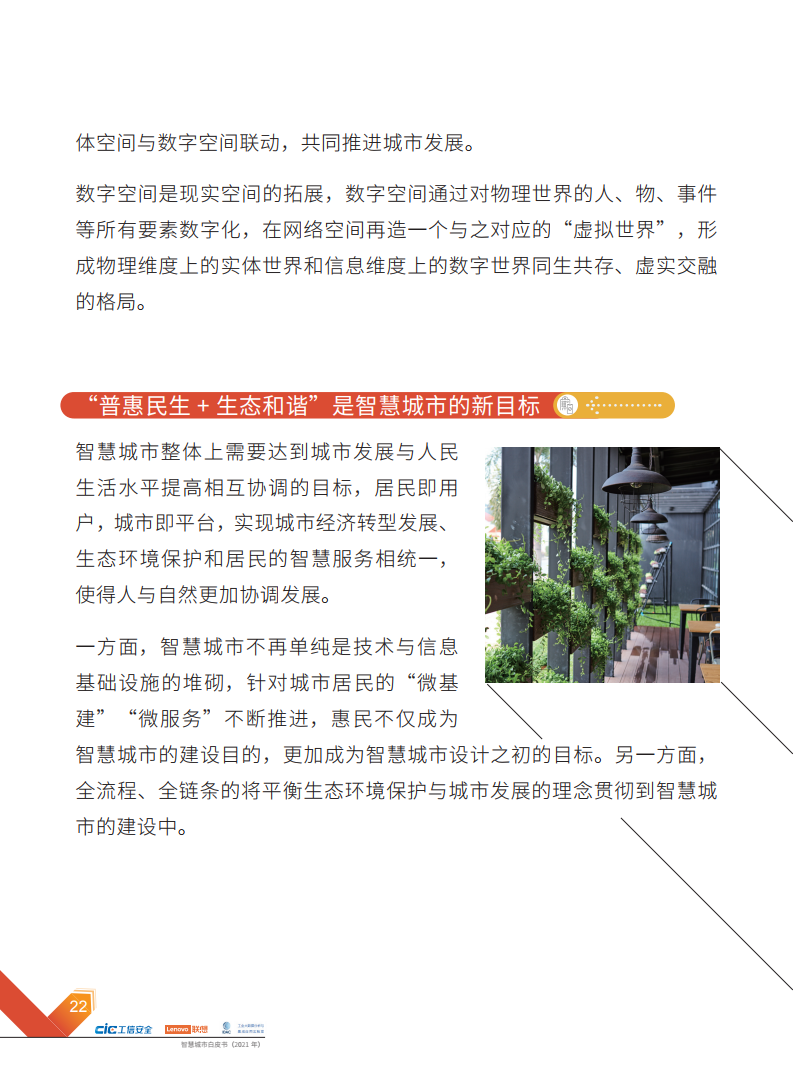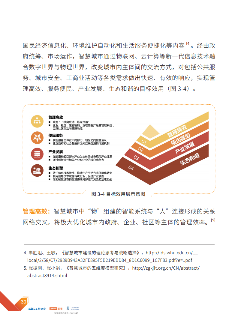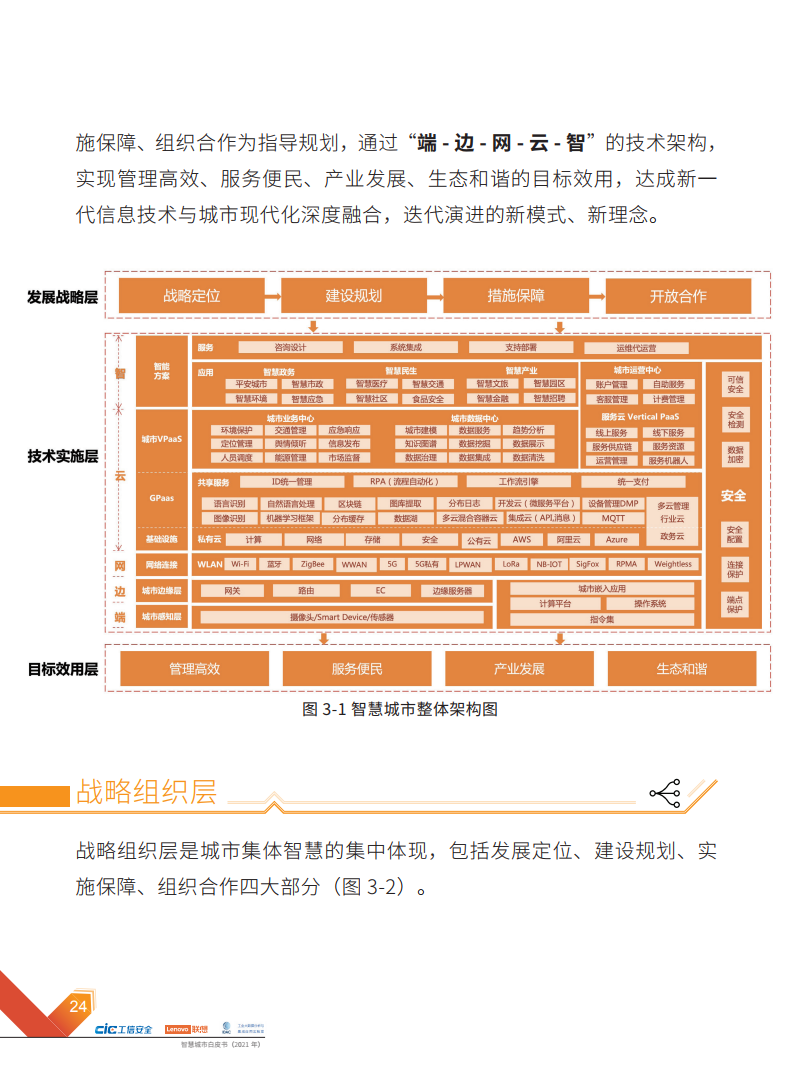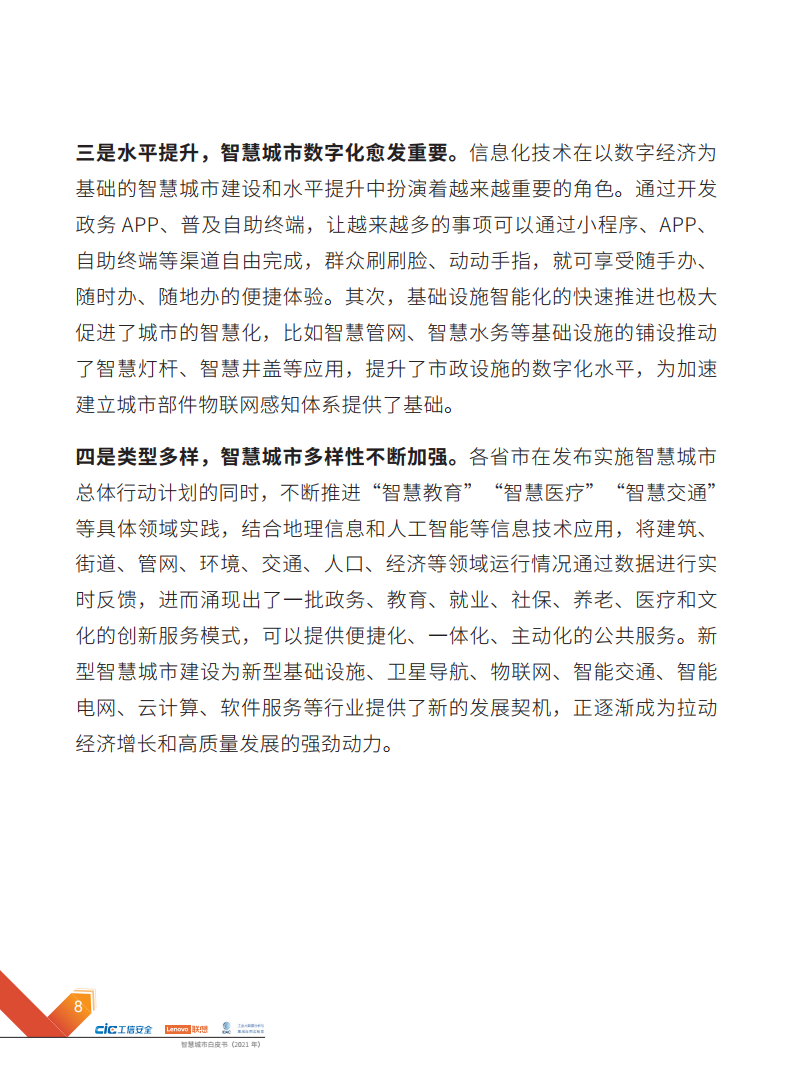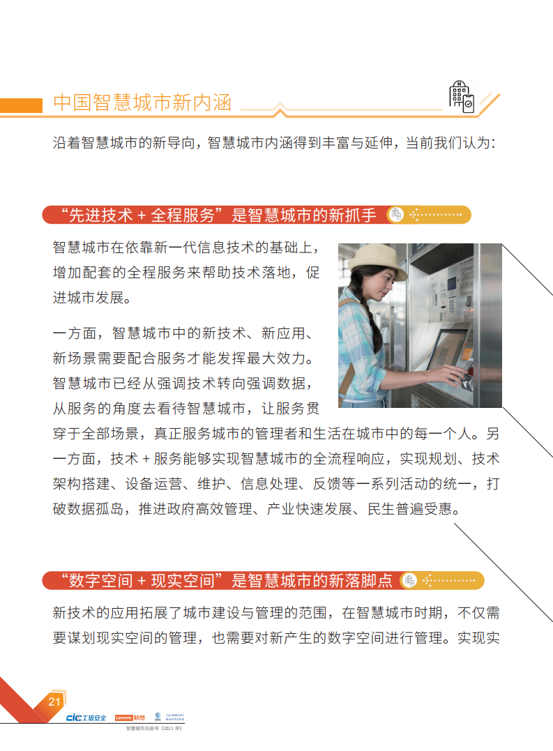 近日,由国家工业信息安全发展研究中心、联想集团、中国产业互联网发展联盟、工业大数据分析与集成应用实验室共同编制的《依托智慧服务,共创新型智慧城市——智慧城市白皮书(2021年)》(以下简称“白皮书”)正式发布。该白皮书采用案例分析、实证分析、调研分析等研究方法,深入剖析我国智慧城市发展历程与内在规律,针对智慧城市当前的发展情况,提出一系列智慧城市建设的新理念、新架构、新建议,旨在为建设应用技术先进、社会效益良好、生态环境友好的新型智慧城市提供参考。