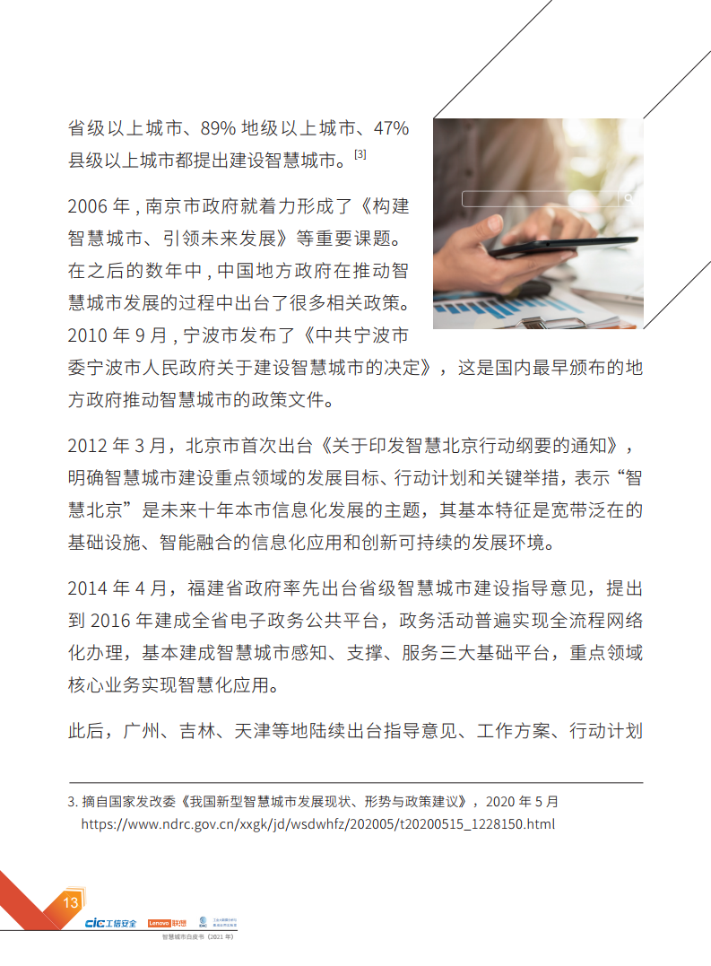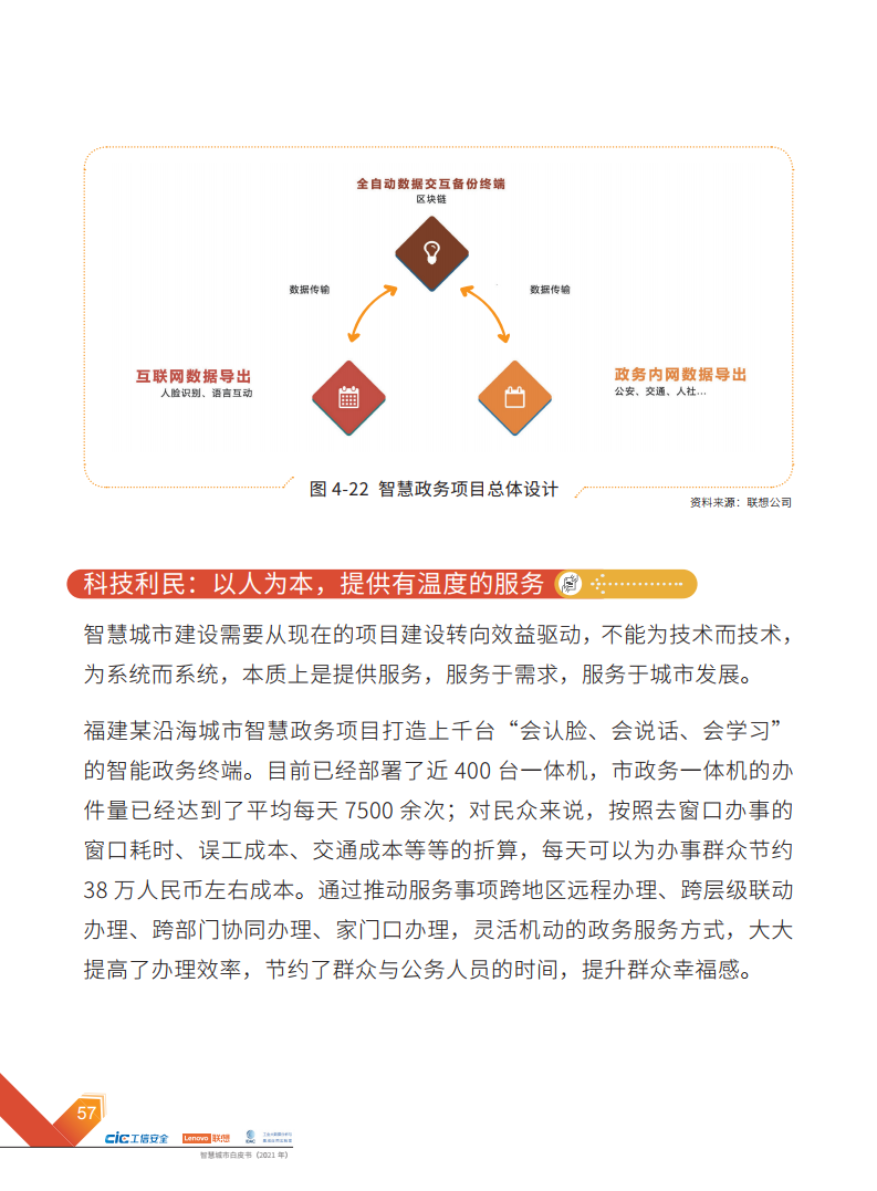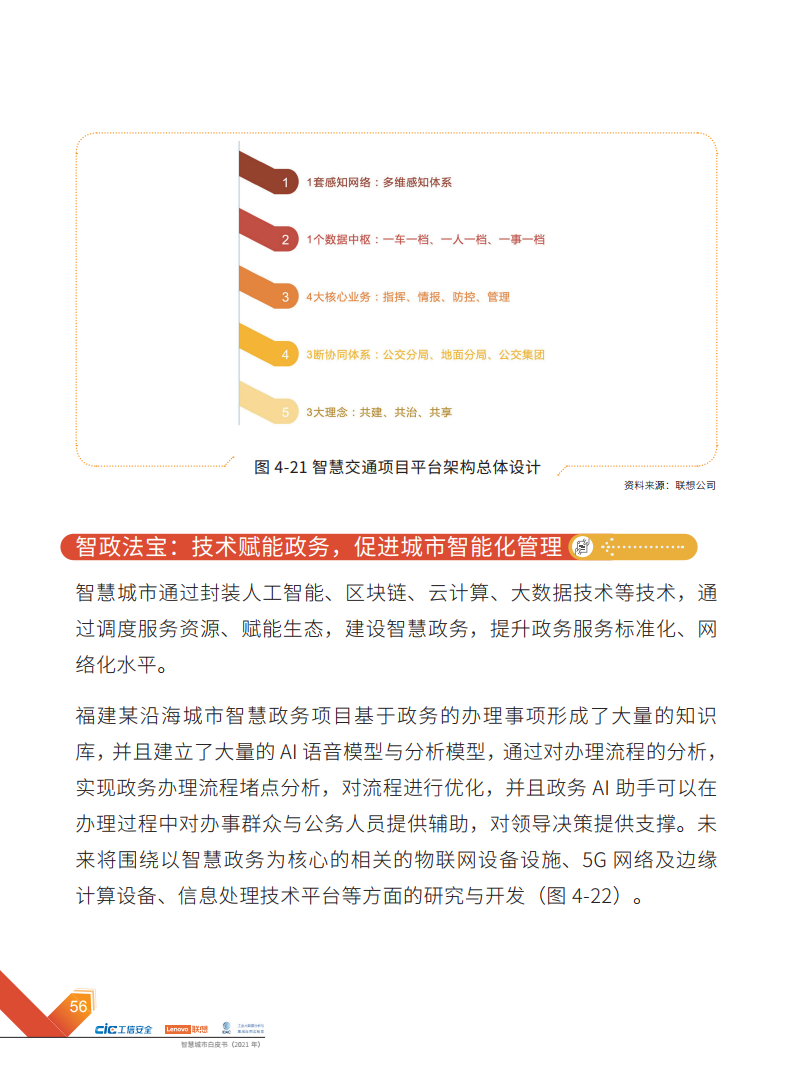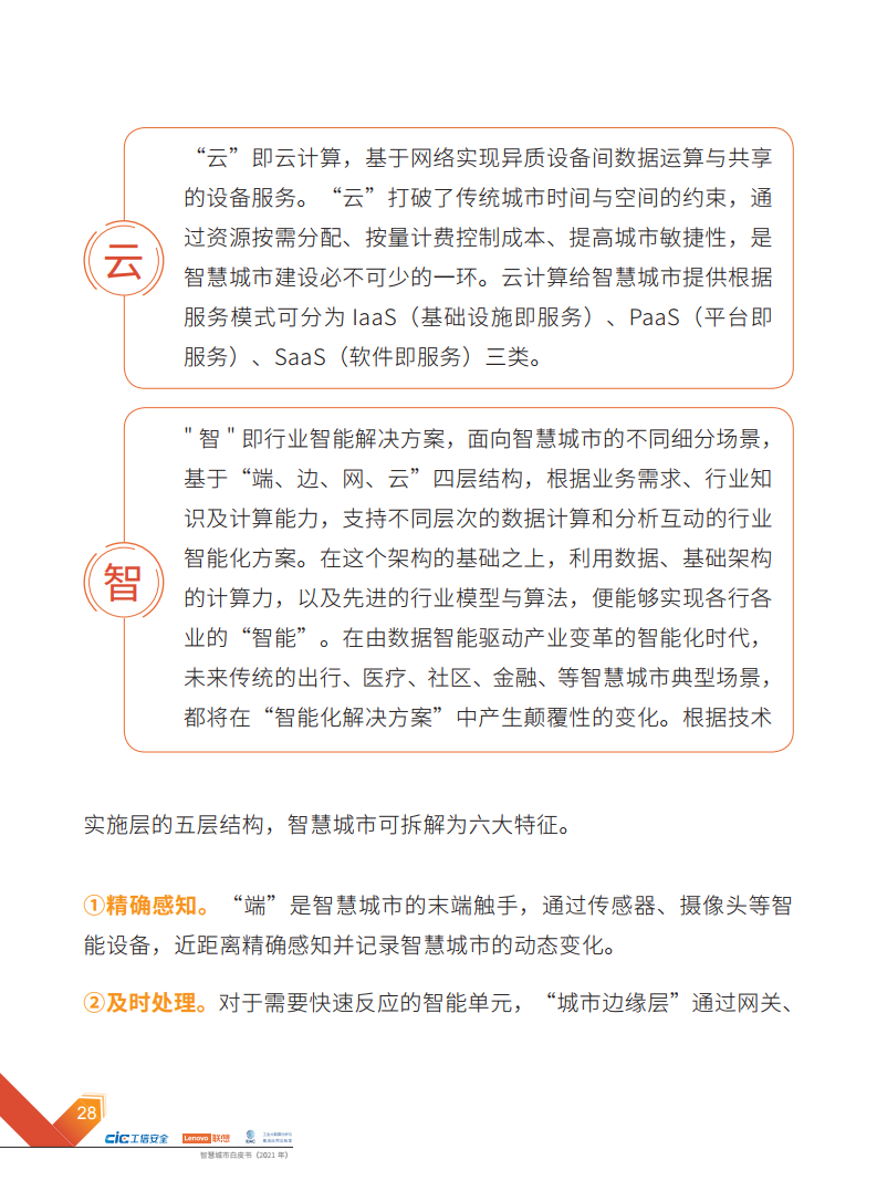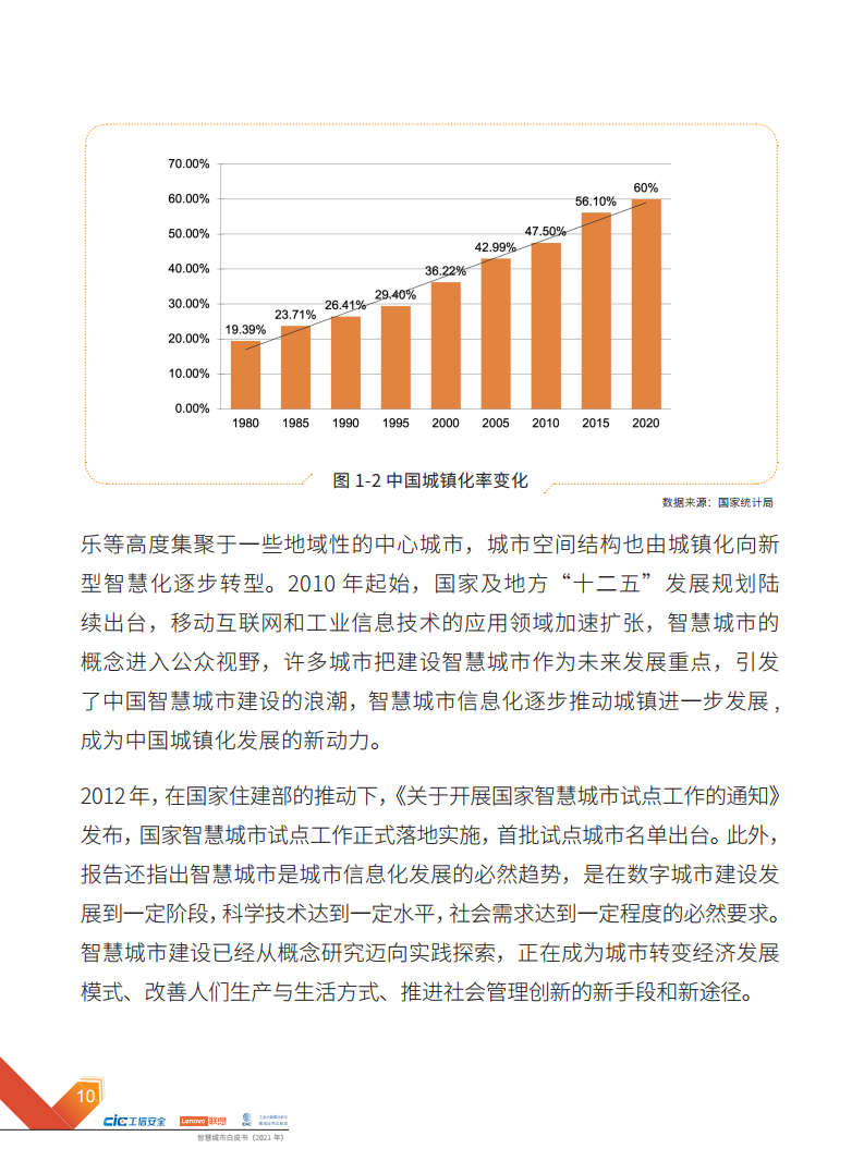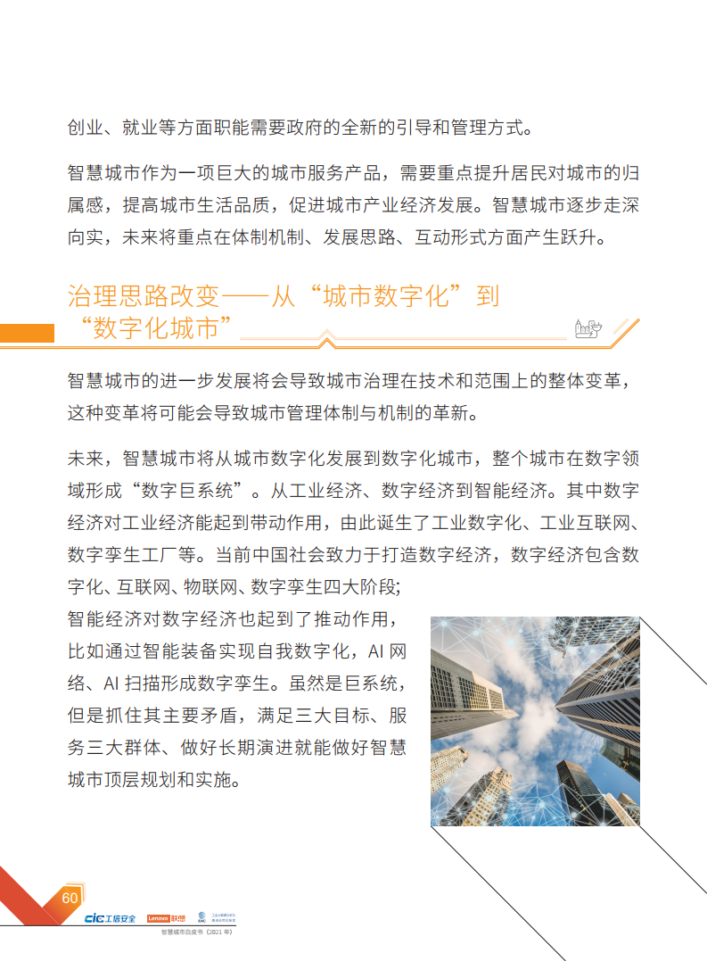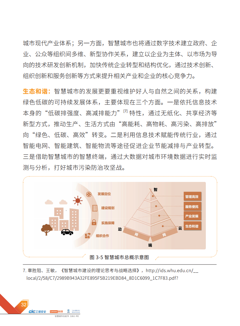 近日,由国家工业信息安全发展研究中心、联想集团、中国产业互联网发展联盟、工业大数据分析与集成应用实验室共同编制的《依托智慧服务,共创新型智慧城市——智慧城市白皮书(2021年)》(以下简称“白皮书”)正式发布。该白皮书采用案例分析、实证分析、调研分析等研究方法,深入剖析我国智慧城市发展历程与内在规律,针对智慧城市当前的发展情况,提出一系列智慧城市建设的新理念、新架构、新建议,旨在为建设应用技术先进、社会效益良好、生态环境友好的新型智慧城市提供参考。