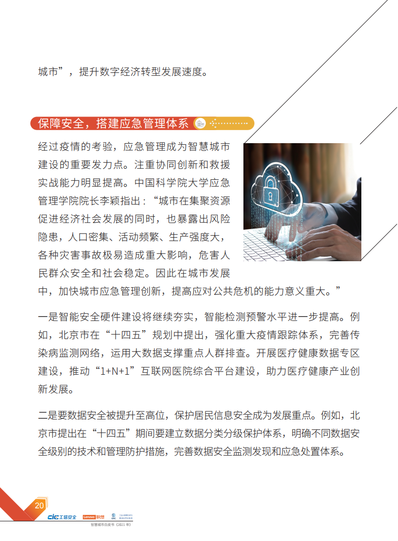 白皮书推出之际正值“十四五”规划审议通过并正式发布,规划明确提出“以数字化助推城乡发展和治理模式创新,全面提高运行效率和宜居度。分级分类推进新型智慧城市建设,将物联网感知设施、通信系统等纳入公共基础设施统一规划建设,推进市政公用设施、建筑等物联网应用和智能化改造”。新型智慧城市建设即将进入新的阶段,该白皮书以真实案例剖析为基础,结合理论和架构研究,形成较为完整的智慧城市体系框架,勾勒出未来可能的发展路径,是新型智慧城市建设的重要参考之一。