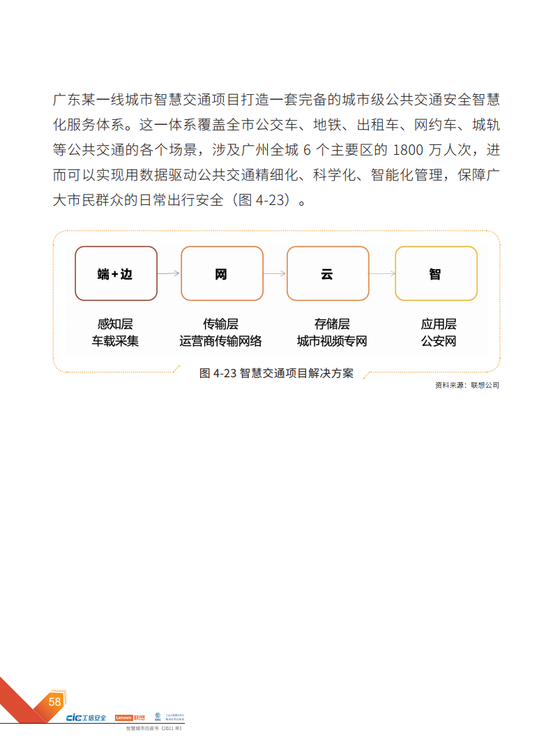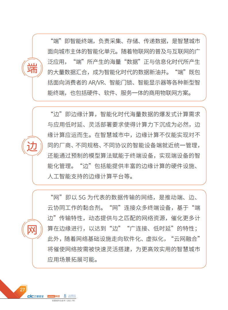 其中,“端-边-网-云-智”作为新型智慧城市的技术实施层,蕴含巨大的创新发展空间,有望成为我国智慧城市技术应用方向的重要创新成果。“端”即智能终端,负责采集、存储、传递数据,是智慧城市面向城市主体的智能化单元。“边”即边缘计算,智能化时代海量数据的爆发式计算需求与应用低时延、灵活部署要求使得计算力下沉成为必然,边缘计算应运而生。“网”即以5G为代表的数据传输的网络,是推动端、边、云协同工作的粘合剂。“云”即云计算,基于网络实现异质设备间数据运算与共享的设备服务。“智”即行业智能解决方案,面向智慧城市的不同细分场景,基于“端、边、网、云”四层结构,根据业务需求、行业知识及计算能力,支持不同层次的数据计算和分析互动的行业智能化方案。