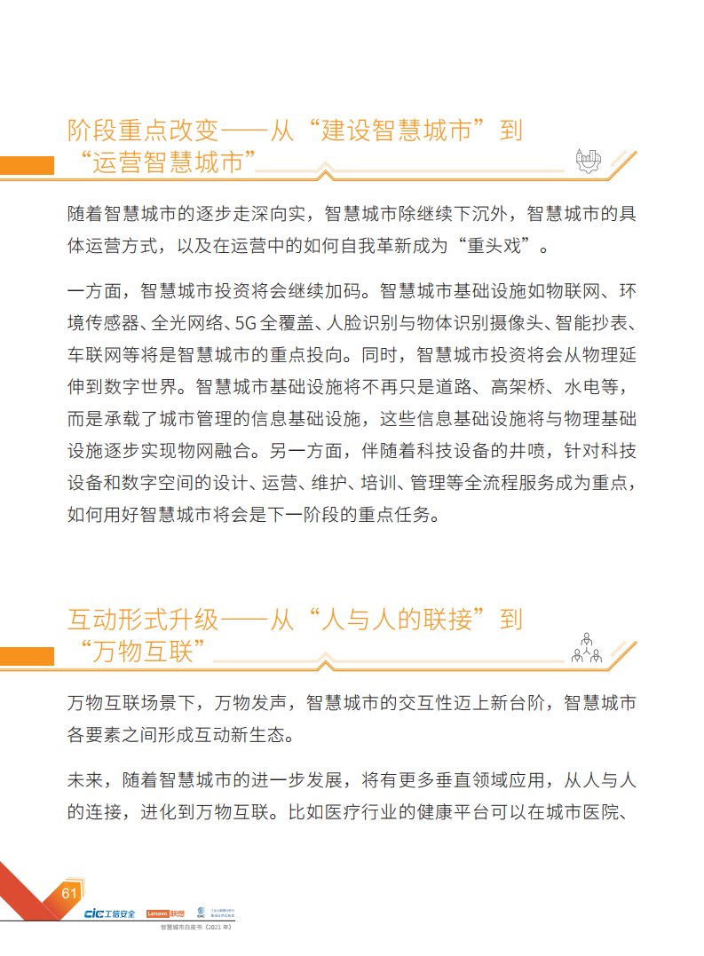 白皮书也对智慧城市未来发展进行了预判,认为在未来新基建和新技术的融合过程中,城市治理或将逐渐完成由“管理型”向“服务型”的转变。智慧城市作为一项巨大的城市服务产品,需要重点提升居民对城市的归属感,提高城市生活品质,促进城市产业经济发展。智慧城市逐步走深向实,未来将重点在体制机制、发展思路、互动形式方面产生跃升。即将出现的变化将包括:治理思路改变——从“城市数字化”到“数字化城市”;阶段重点改变——从“建设智慧城市”到“运营智慧城市”;互动形式升级——从“人与人的联接”到“万物互联”。