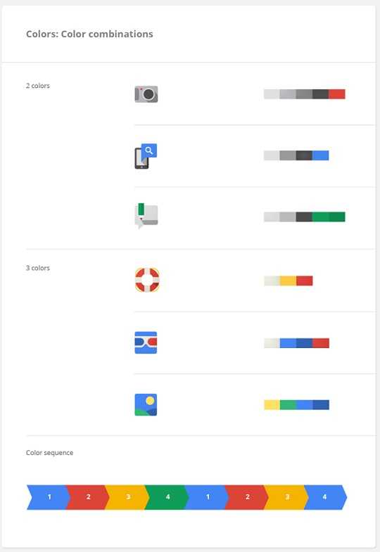 色彩:配色组合——Google的Logo使用的四种颜色(蓝、红、黄、绿)也是Google在其他设计上的首选配色,而且配色的优先级也是“蓝→红→黄→绿”。
