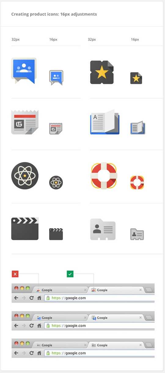 产品icon创作要求:16px调整原则——作为icon的最低尺寸,16px的表达面积过下,按照原有尺寸进行同比压缩会造成部分细节的丢失,为了避免这个问题,Google规定必须对16px尺寸下的icon进行重制,突出必要的设计元素,这种做法在实践上有着良好的案例表现。