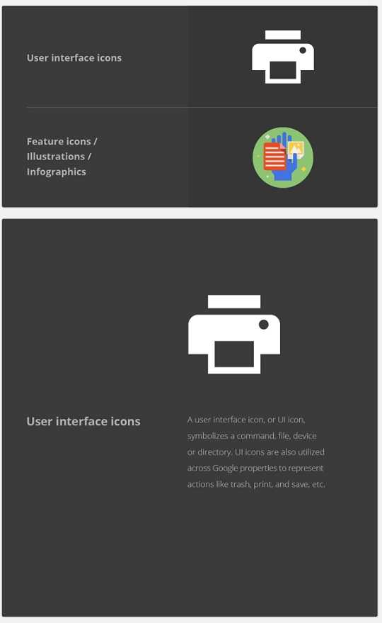 Google的设计还包括一些特殊的用户界面icon以及功能/插图/信息图表icon,它们通常代表命令、文件、设备等,有时也象征具体的行动指引,如保存、打印、删除等。
